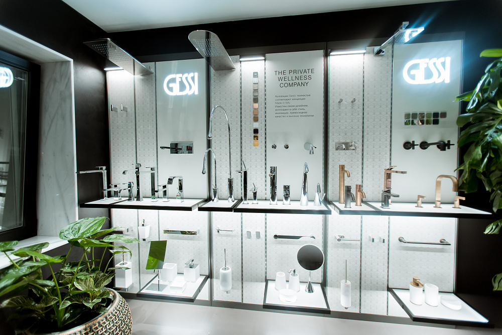 Экспозиция шоу-рума, дизайн-концепцию которого разработала студия Bolshakova Interiors, представлена в изысканном интерьере с атмосферой high living. Пространство презентует инновационные идеи и ведущие коллекции от флагманов Wellness направления — брендов Gessi, Antolini и Dedon.