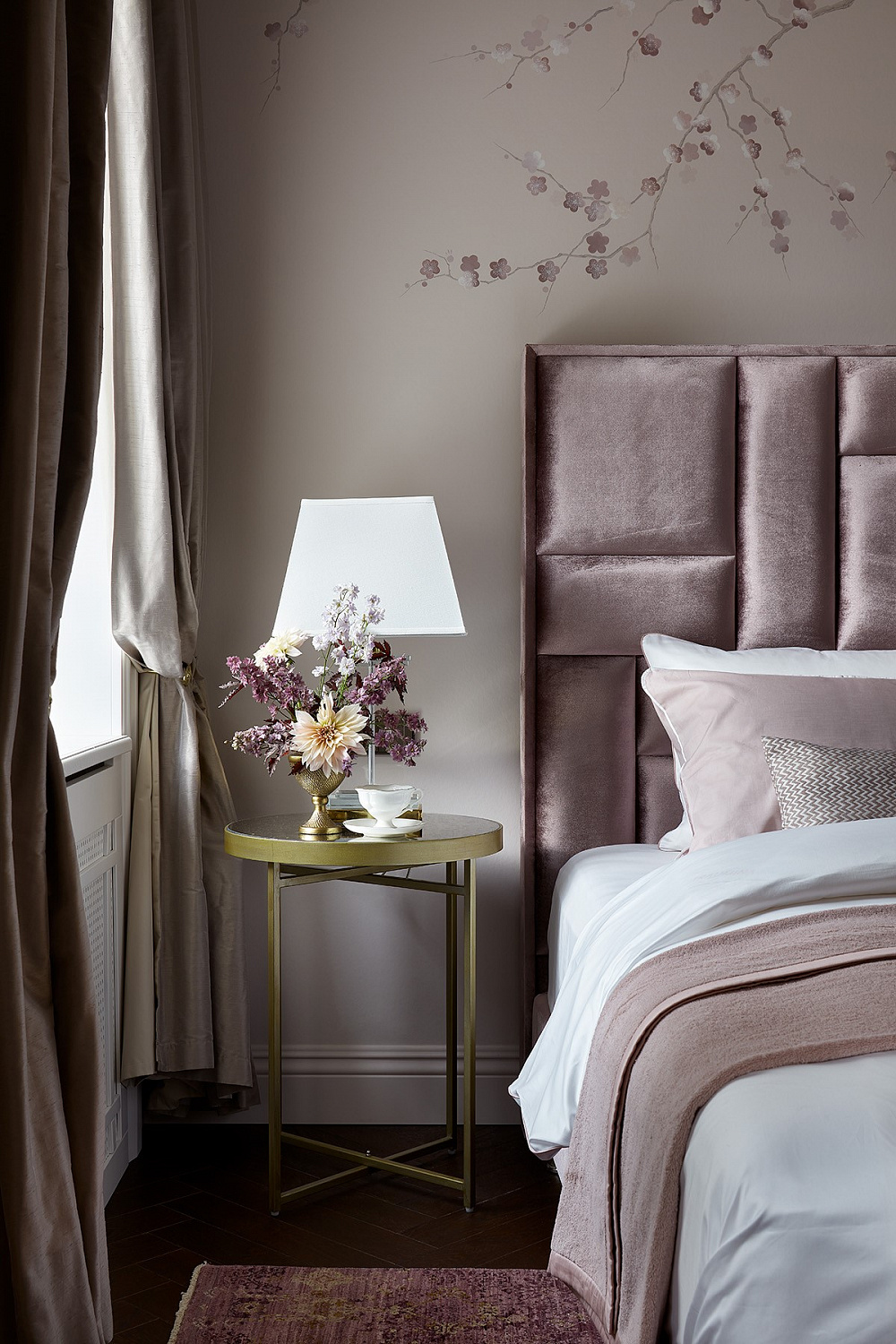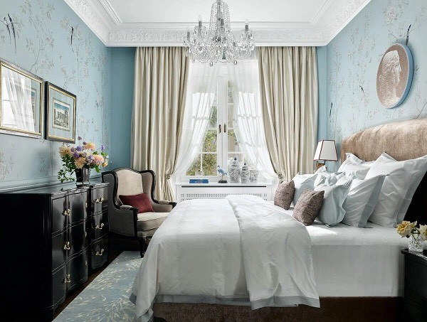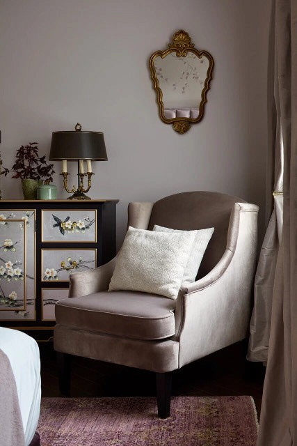 В приватной части квартиры расположились две спальни: хозяйки и ее дочери. Первая выдержана в голубых тонах с элегантными обоями с ручной росписью и высокой кроватью с бархатной спинкой, которая задает особый масштаб: под стать ей пришлось подбирать другие подчеркнуто крупные предметы. Вторая — девичья, нежная, в серо-розовых тонах с деликатной росписью на стенах и комоде.