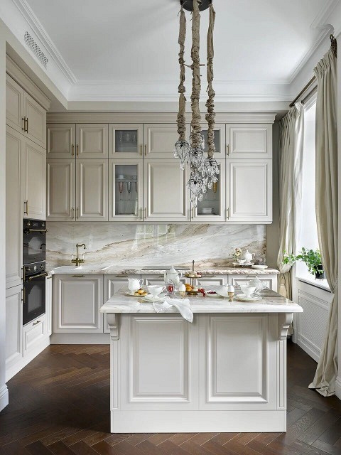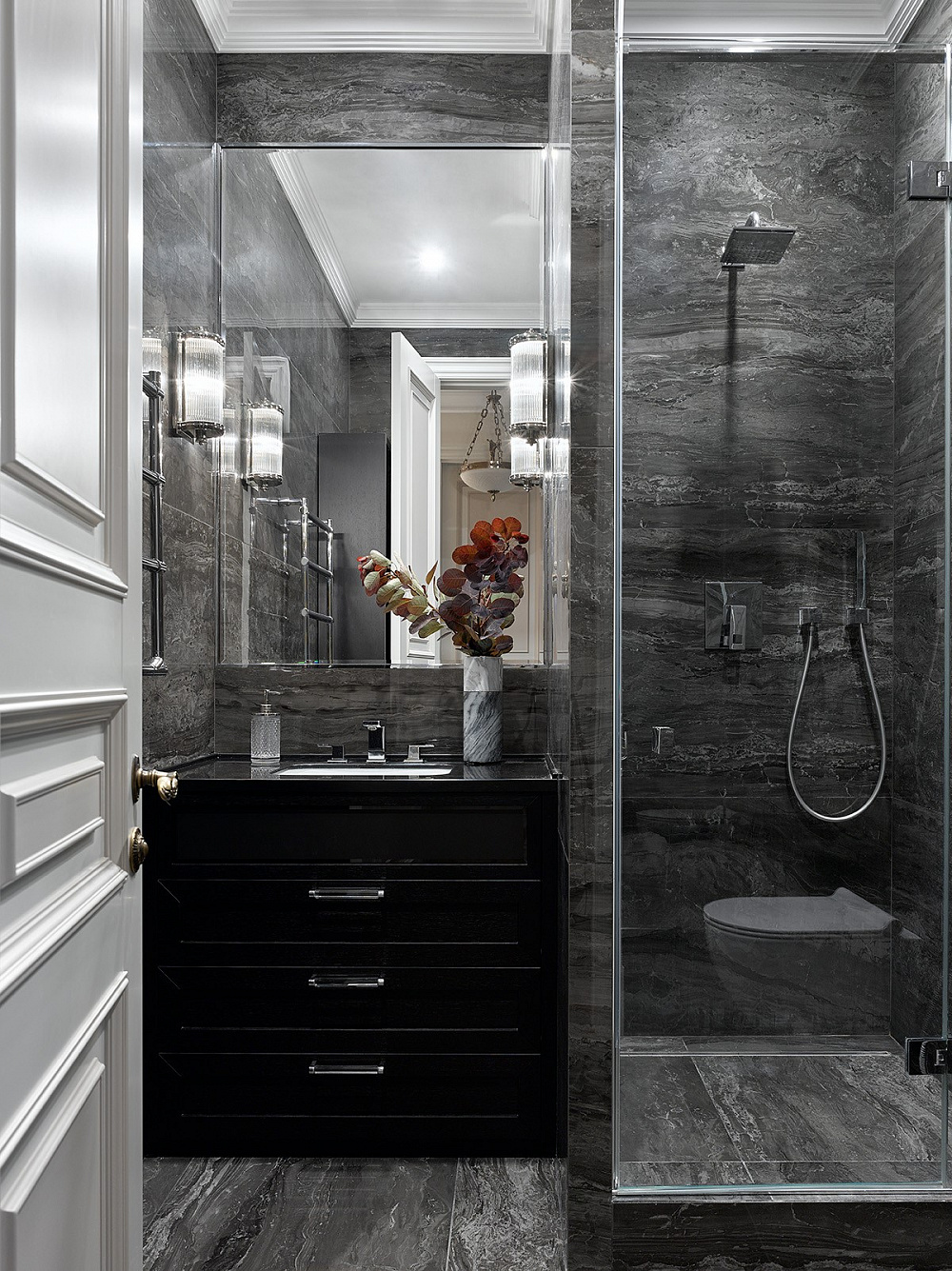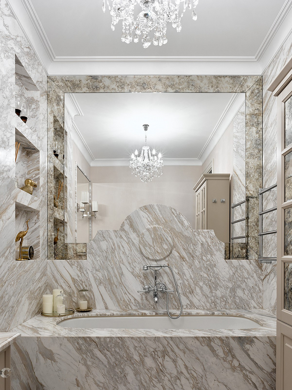 Также благодаря любви хозяйки к Италии в квартире используется много мрамора, в частности в отделке ванной комнаты, кухни и прихожей. Дом «с парадным» подсказал по-петербургски серьезное отношение к достоверности исторических деталей: вся фурнитура от дверных ручек до оконных кремон выполнена в реставрационных мастерских, которые занимаются историческими памятниками. Например, латунные дверные петли здесь точь-в-точь как в Адмиралтействе. Не самый заметный глазу фрагмент, но именно из них складывается высокое качество пространства и жизни в нем.