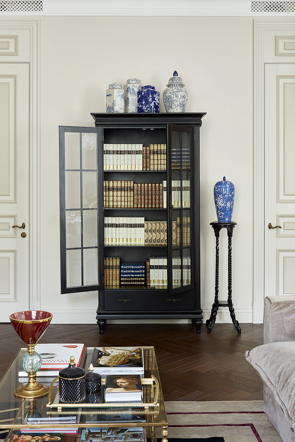 Весь интерьер сложен из тщательно отобранных, «единственно верных» вещей, неспешно собранных в антикварных магазинах Европы и сделанных на заказ. Гостиную фланкируют два комода в стиле шинуазри с тонкой золотистой росписью, вторящей золотой раме зеркала, а две симметричных хрустальных богемских люстры подчеркивают парадность пространства. Блеск латуни и хрусталя, сложность росписи и резьбы уравновешивает современная графика ковра и подушек и уютная лаконичность дивана. Живопись Егора Острова, созданная в его фирменной «растровой» технике, подчеркивает что классика и современность «работая» вместе способны создавать новые образы и новые смыслы.