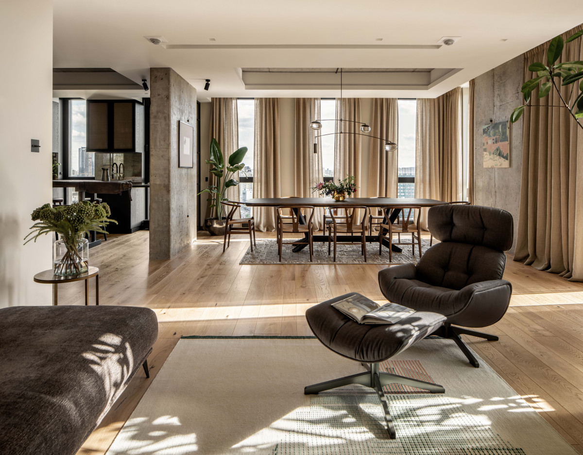 Незважаючи на брутальні матеріали, інтер’єр не відчувається холодним: метал і грубий бетон урівноважені паркетом теплого відтінку, натуральним текстилем, великою кількістю рослин і продуманим освітленням.