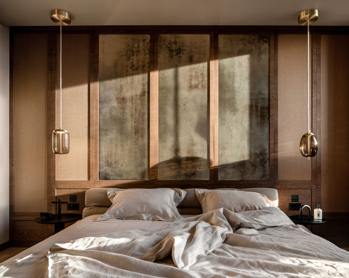 Настінні панелі за узголів’ям ліжка із зістарених дзеркал переходять у систему зберігання з інтегрованими сидіннями у вікнах та освітленням для читання. Натуральні матеріали, приглушене світло й темна стеля спальні визначають її основну функцію — відпочинок і відновлення.