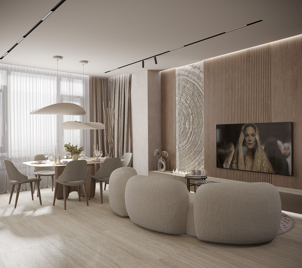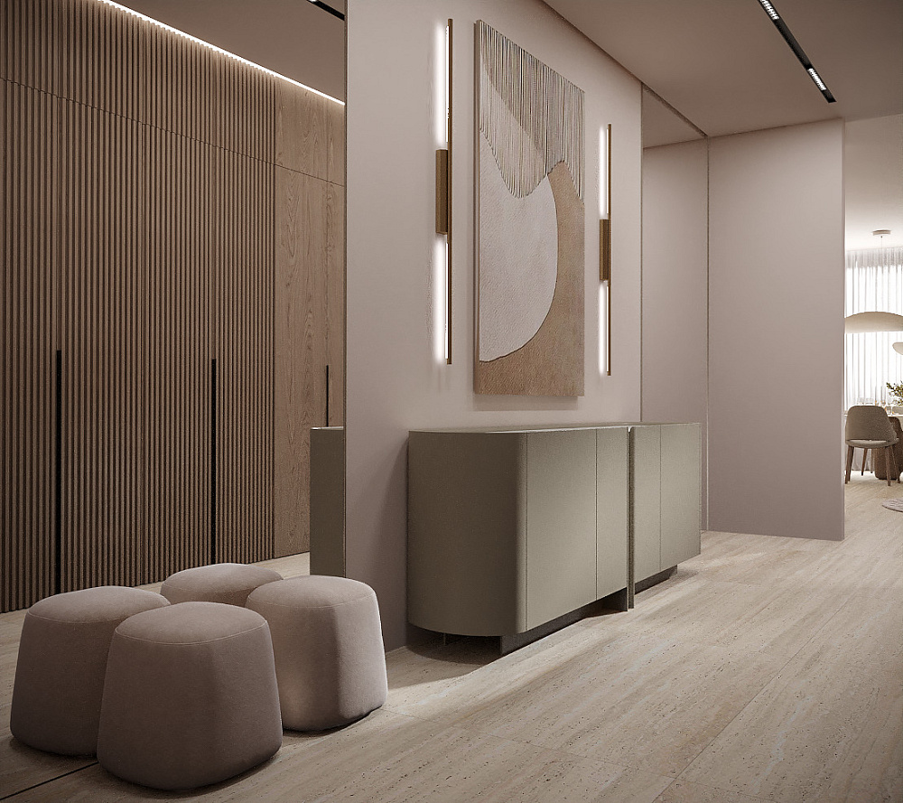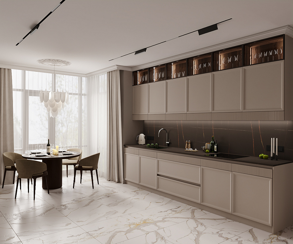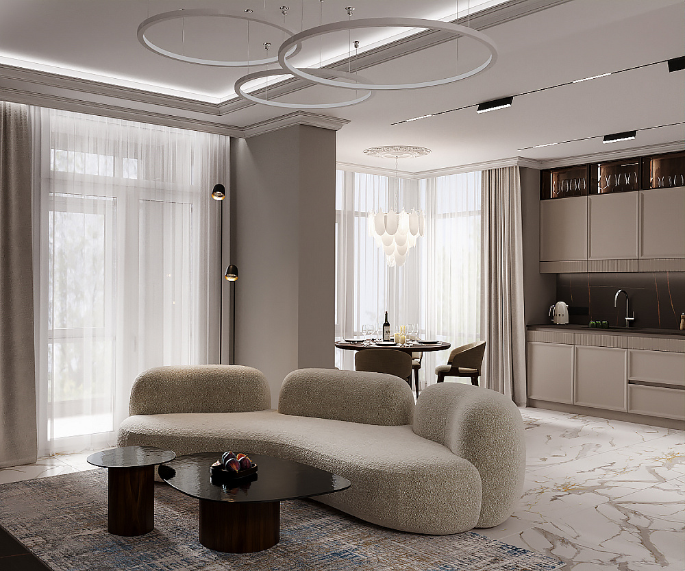 Приємні оку ергономічні силуети меблів створюють відчуття легкості у просторі, а м`які нейтральні відтінки, близькі до природної палітри, цей ефект підкреслюють. Бежевий, молочний, вершковий, off-white білий — створять полотно для справді коштовних обʼєктів у вашому інтерʼєрі та дозволять підкреслити їх цінність. Матова обробка посилить відчуття рівневості, але для додаткової акцентності подекуди можна обрати й глянцеві текстури, проте робити це краще дозовано.