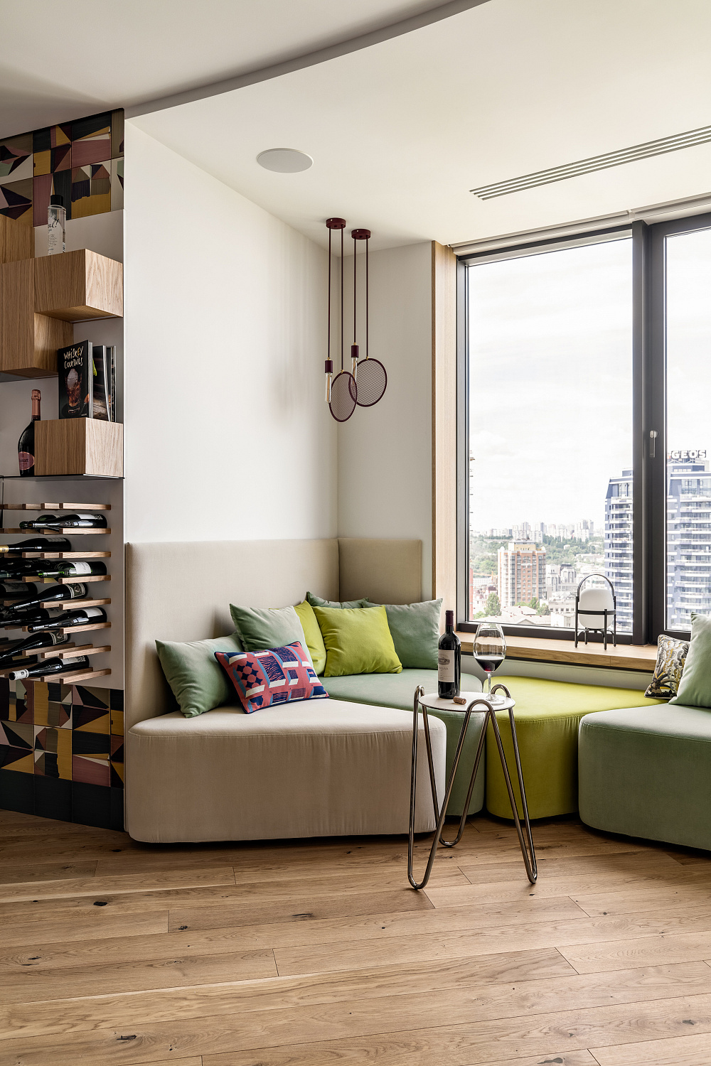 «Наши клиенты — это пара, которая много путешествует, ведет активную и яркую жизнь. Квартира в центре Киева — это их жилище в котором они проводят только часть своего времени. Перед нами стояла задача создать яркий и неординарный дизайн, как отражение жажды к приключениям его хозяев. Еще одна страсть в жизни наших клиентов — это вино! Ему отведено центральное место в виде исполненных на заказ по нашему проекту винных полок в обрамлении яркой плитки Bardelli», — рассказывает дизайнер Людмила Забогонская.