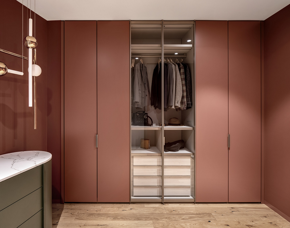 Также яркой и неординарной получилась гардеробная от Poliform в очень необычном цвете.