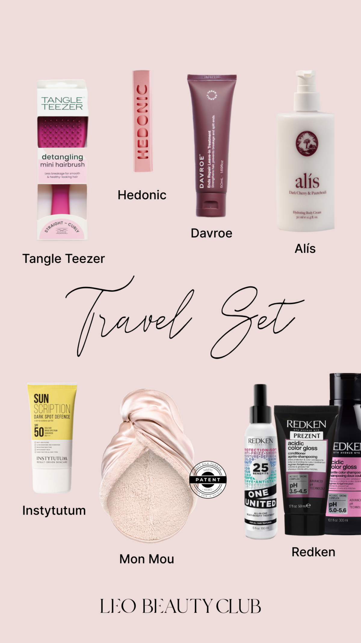 Сет включає засоби для догляду за волоссям, тілом та обличчям: сонцезахисний крем Subscription Dark Spot Defence SPF50 від Instytutum, гель для фіксації брів від Hedonic, незмивний еліксир для відновлення кінчиків волосся Ends Repair Treatment від Davroe, щіточка Tangle Teezer, крем для тіла Alis з поживними оліями марули та ши, двосторонній рушник-тюрбан Mon Mou з натурального 100% шовку та махри, а також шампунь та кондиціонер Acidic Gloss від Redken та спрей One United, які допоможуть відновити блиск та здоров’я волосся після впливу сонця, солоної або хлорованої води.
