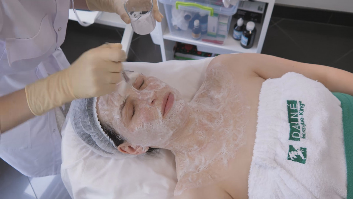 После очищения на кожу лица, шеи и зону декольте мне нанесли маску Enzyme Masque № 1, смешанную с активатором Desquamate Lotion.