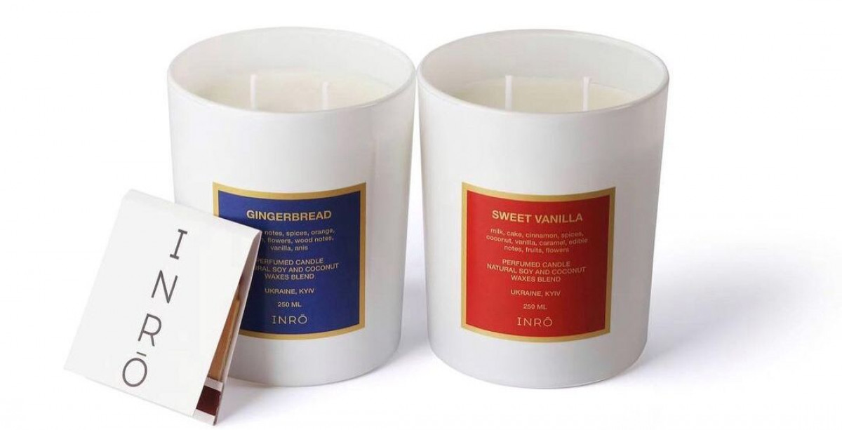 Sweet Vanilla от Inro — свеча с нотами молока, выпечки, корицы, специй, кокоса, ванили, карамели, фруктов и цветов. Gingerbread от Inro — свеча с ароматом специй, апельсина, лимона, цветов, древесины, ванили и аниса.