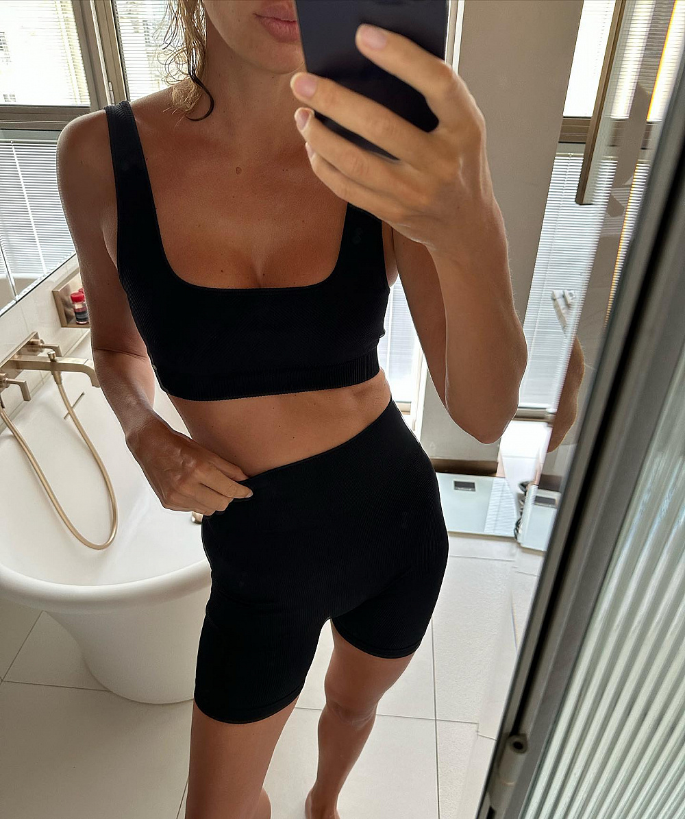 10. Сьогодні співвласник beauty-бренду Sister`s Aroma Юлія Бурковська у своєму Instagram-акаунті анонсувала запуск спортивного напряму. На фото можна побачити стильний топ та велосипедки для занять фітнесом у вугільно-чорному кольорі.