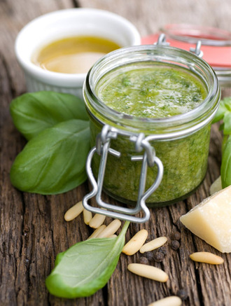 В блендере или с помощью мраморной ступки измельчите кедровые орешки (или семена пинии), чеснок, сыр. Добавьте соль и постепенно разбавляйте полученную массу оливковым маслом холодного отжима до консистенции сметаны. Соус можно растирать пестиком или ложкой в миске либо измельчить при помощи блендера или кухонного процессора.