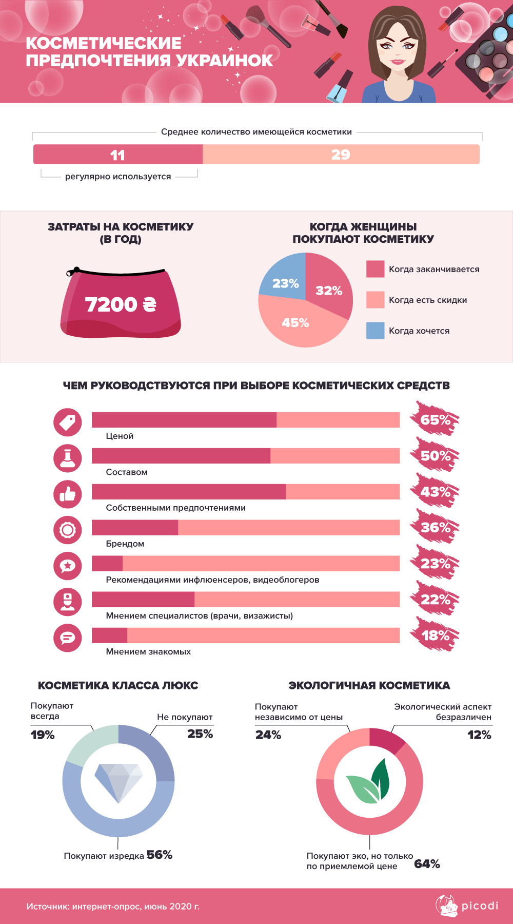 Косметички украинок довольно объёмные — в среднем там находится 29 продуктов. При этом среднестатистическая жительница Украины тратит на косметику примерно 7200 гривен в год, а из 29 средств регулярно использует только 11. 44% опрошенных украинок покупают свою любимую косметику, когда есть скидки, то есть про запас. Покупают нужные косметические средства, когда те заканчиваются, 33% женщин, а 23% — когда хотят.