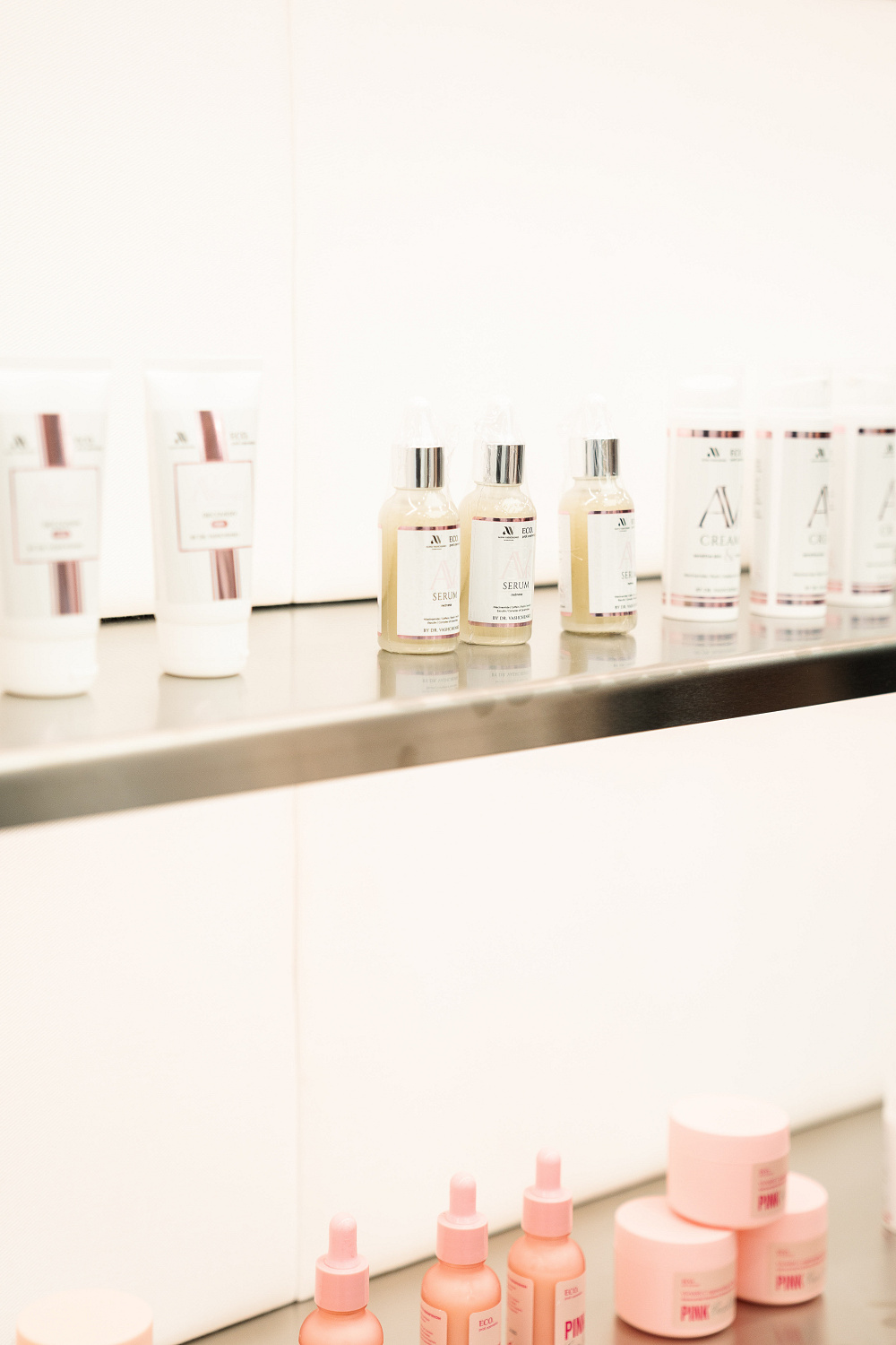 Простір поділений на шість зон, що символізують етапи догляду: очищення, відлущування, тонізацію, насичення, зволоження та точкові рішення — наочна система, яка допомагає легко вибудувати правильну рутину догляду.