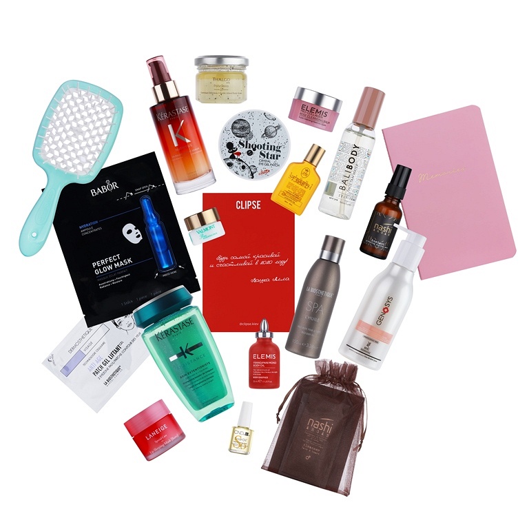 В боксе представлены полноразмерные продукты: кислородный очиститель Genosys, который способен преобразить вашу кожу, вода для идеального и ровного загара лица Bali Body, ночная сыворотка для волос и шампунь с уникальной технологией от Kerastase, расслабляющее масло для тела от la biosthetique, питательная маска для губ с экстрактами ягод Laneige, инновационная расческа Janeke, ампульная маска с минералами и микроэлементами от немецкого бренда Babor, гидрогелевые патчи shooting star.