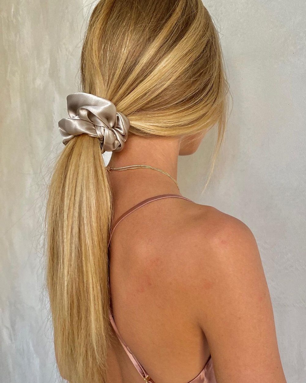 Беспроигрышный вариант, если нужно замаскировать жирные волосы – повязать на голову широкий платок или сделать высокий пучок с большой резинкой. Выбирайте широкую резинку из объемного шелка, которая не будет утягивать пряди, но сместит фокус внимания от корней волос на эффектный пучок из волос. Такие резинки выпускает украинский бренд женской одежды из натурального шёлка Serenity.