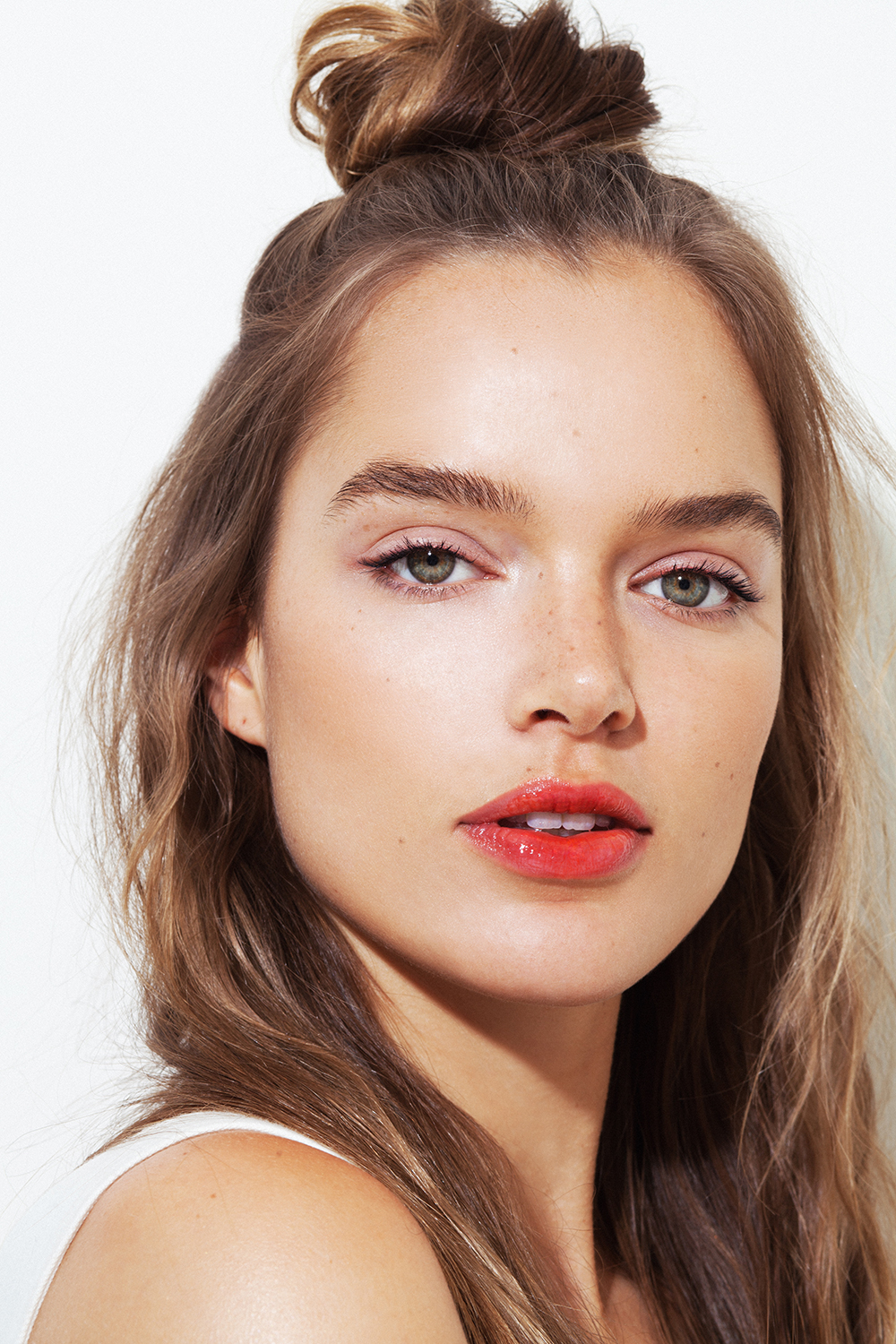 Важный элемент такого макияжа — брови. Они должны быть густыми, но сохранять естественность. Здесь вам пригодится мягкий матовый карандаш, с помощью которого нужно просто заполнить линию бровей, не меняя их форму. Легкий стробинг на скулах и блики светлыми тенями во внутренних уголках век создадут эффект прозрачности.