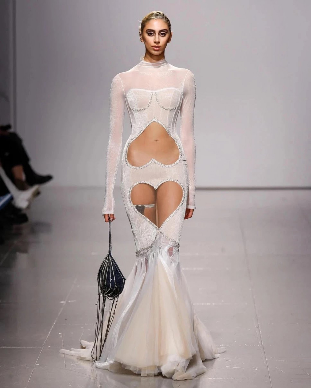 Біла корсетна сукня з характерними для бренду вирізами у формі сердець вперше була представлена цього року в колекції FROLOV сезону осінь-зима — 2023/24 під час Тижня моди в Лондоні.