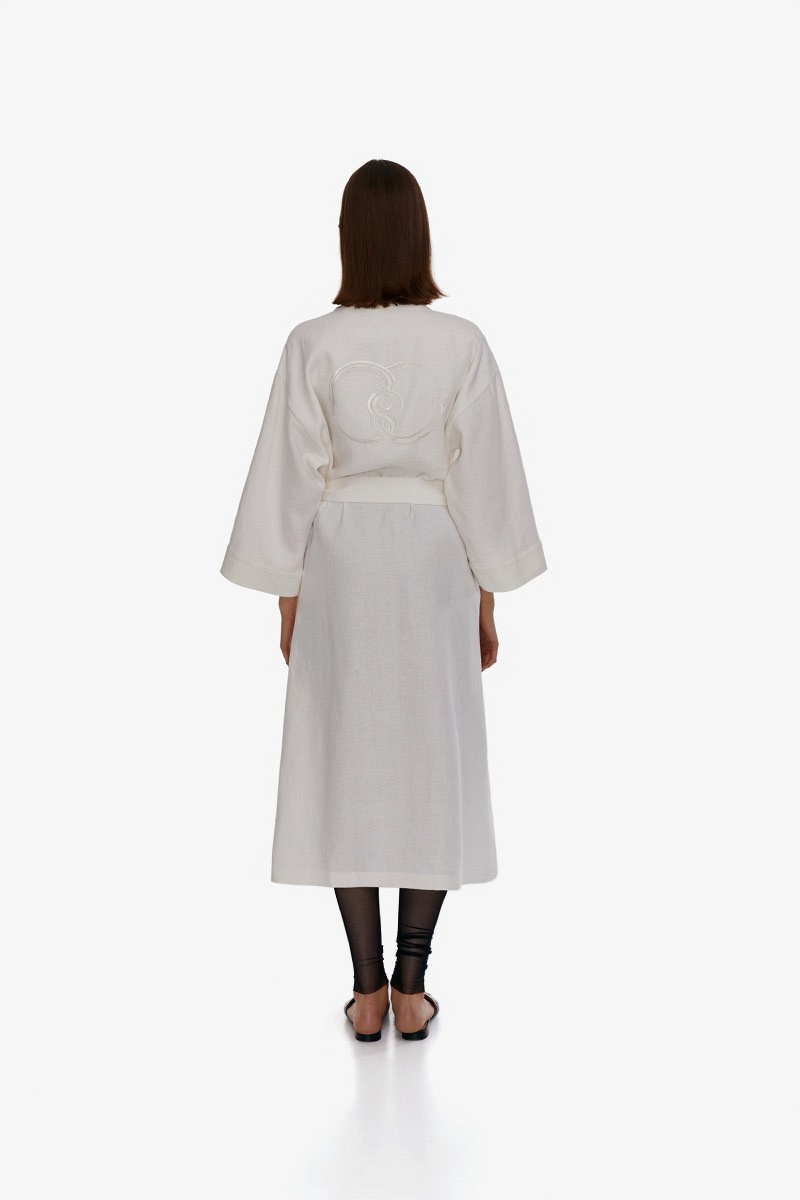 Б. К. Я в восторге от нашего Kimono Robe. Это очень красивая и мега-практичная вещь, ведь носить ее можно как угодно — саму по себе, с джинсами в качестве накидки или с легинсами. Мне особенно нравится, как получилась фирменная вышивка змей на спине. Дле тех, кто осторожничает носить белый, мы выпустили черную, укороченную версию кимоно. Хотя я настаиваю на белом!