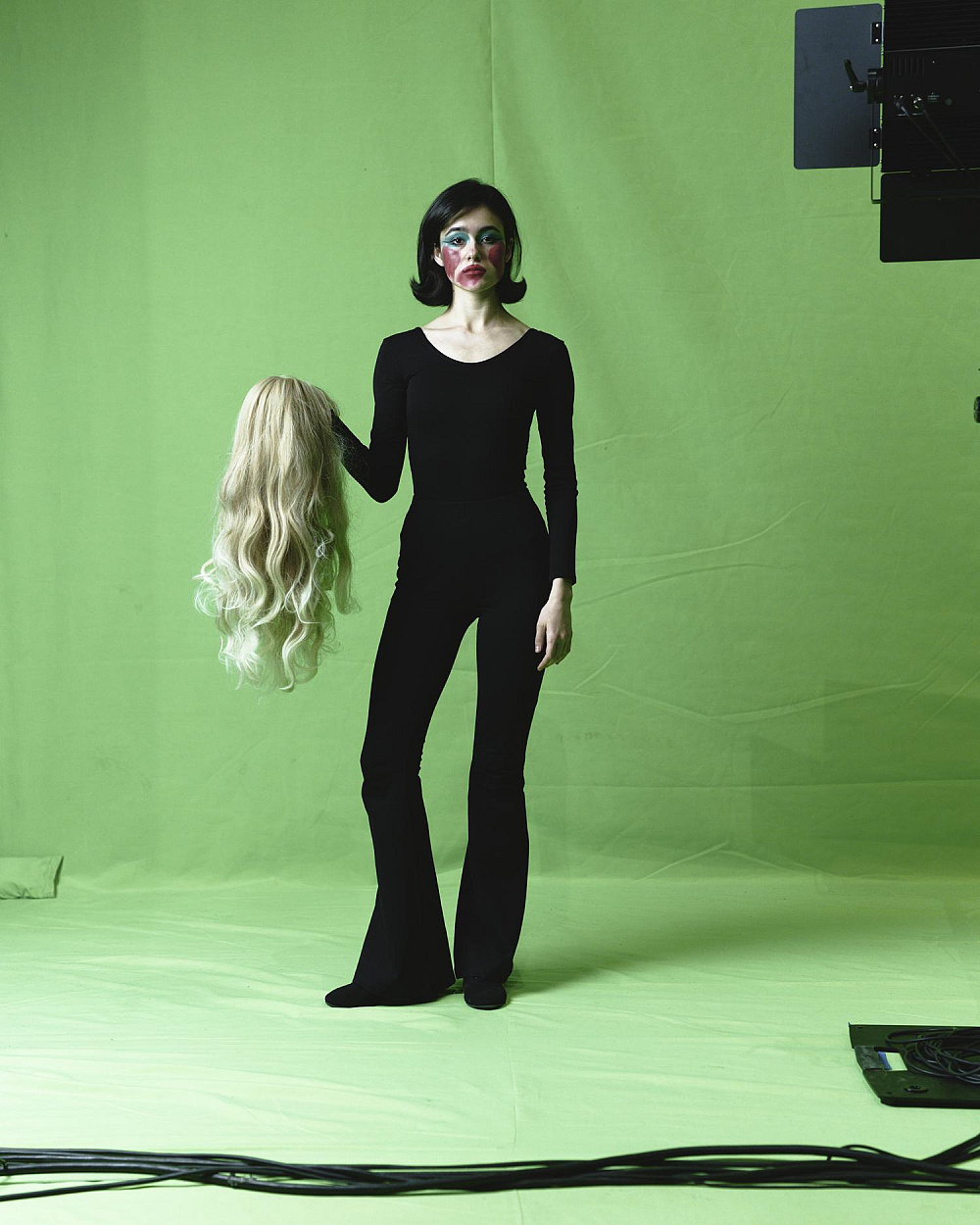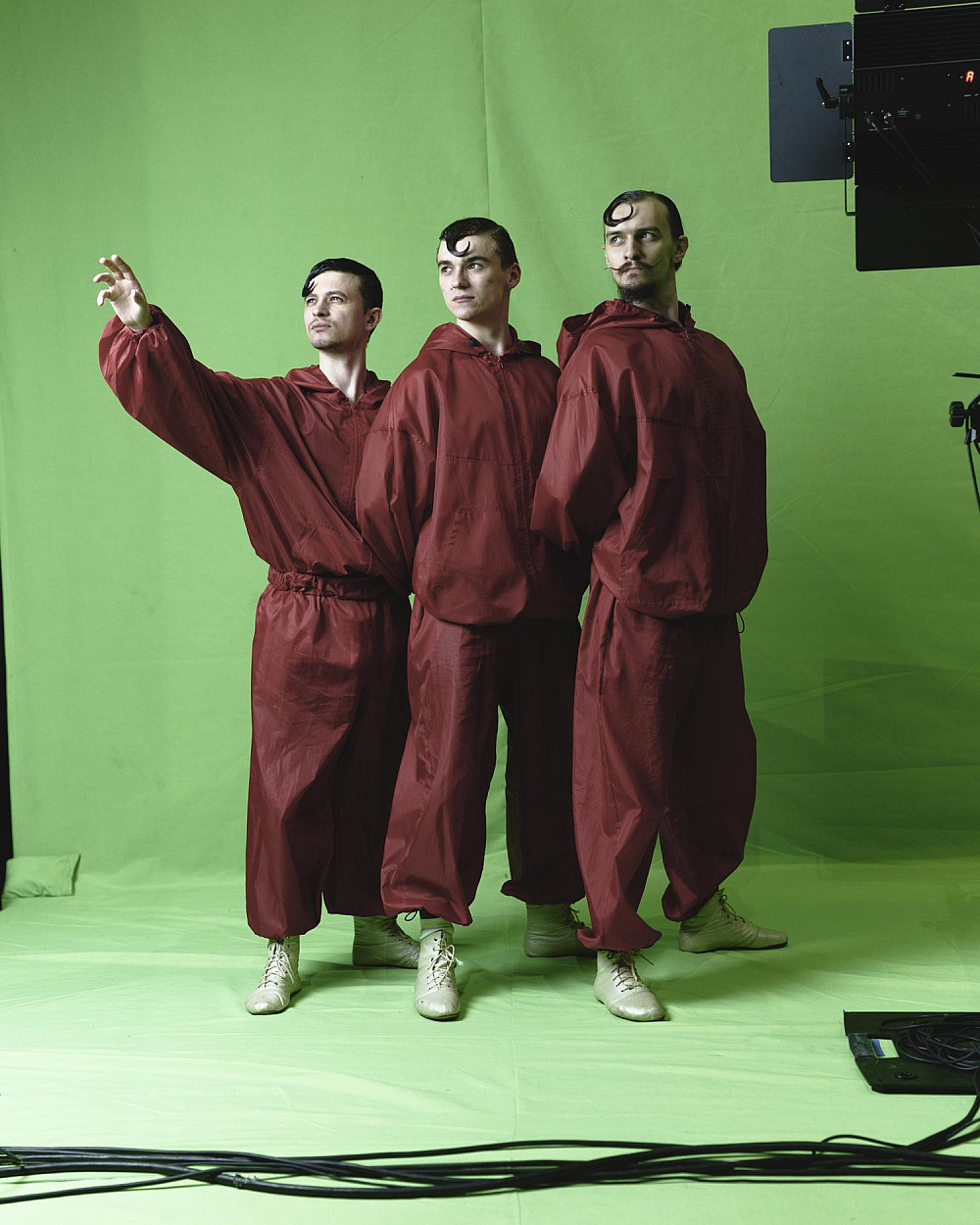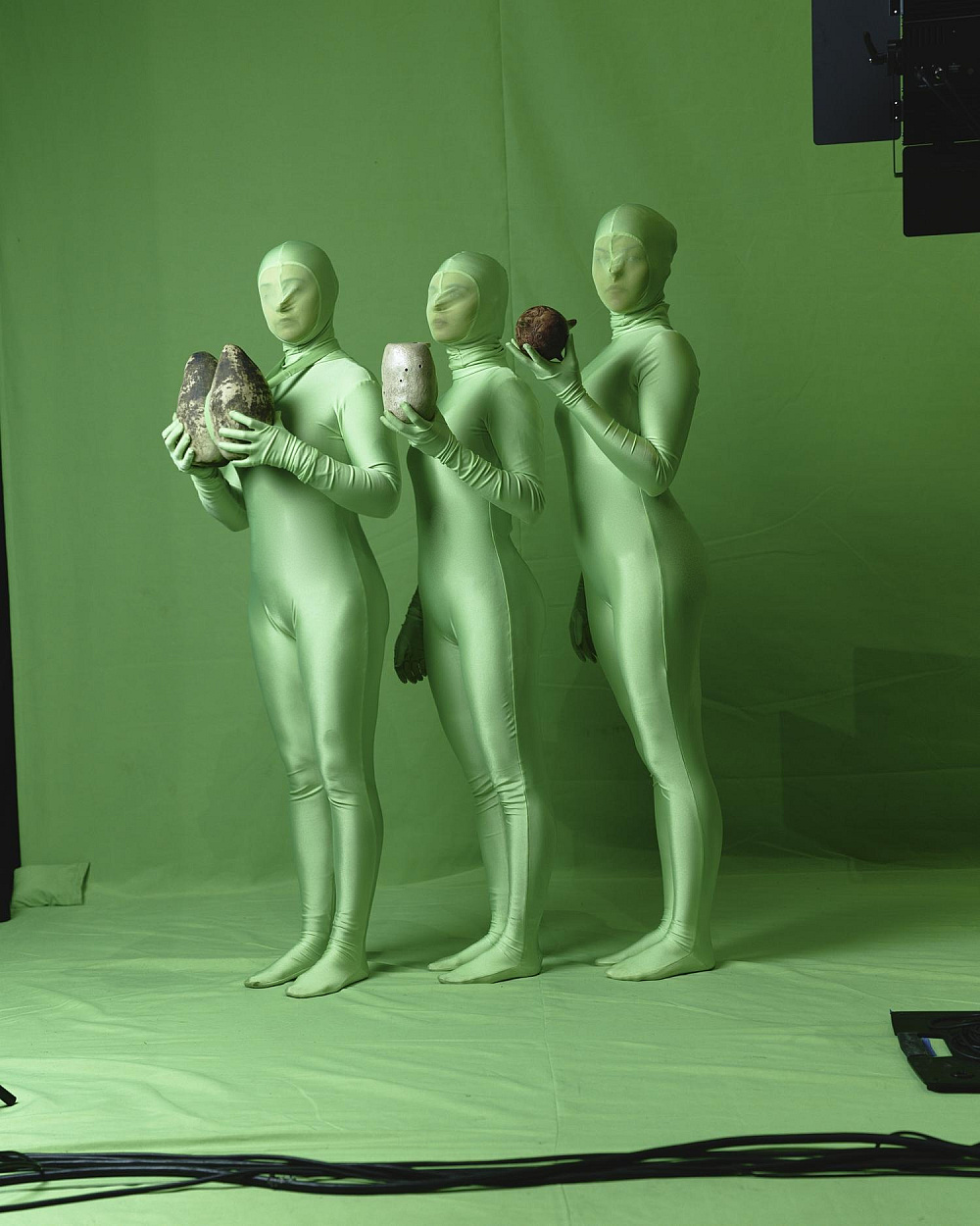 Протягом усієї вистави їхні ролі змінюються, але ми навіть у кінці не бачимо їхніх облич — вони сховані за костюмами музиканток і хористок. Тож центром є стирання субʼєктності, уніфікація, поглинання маніпулятивним простором хромакею.