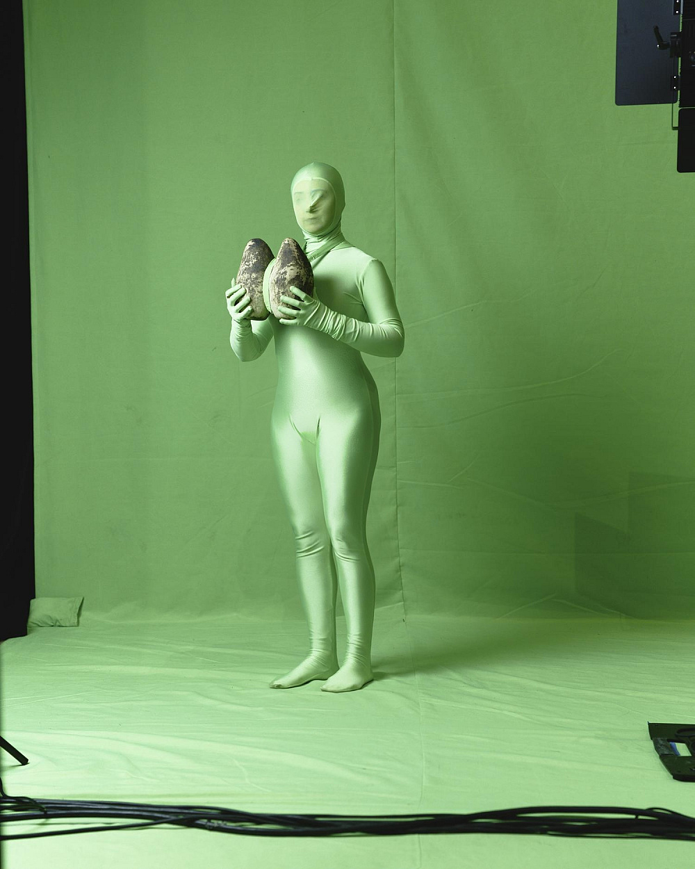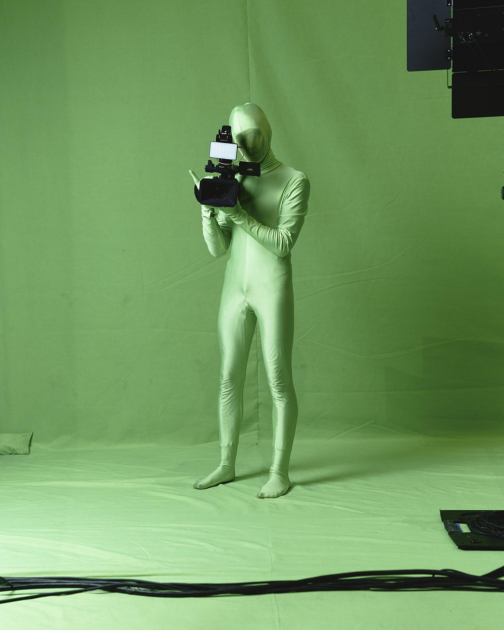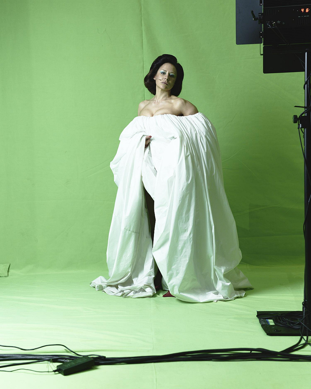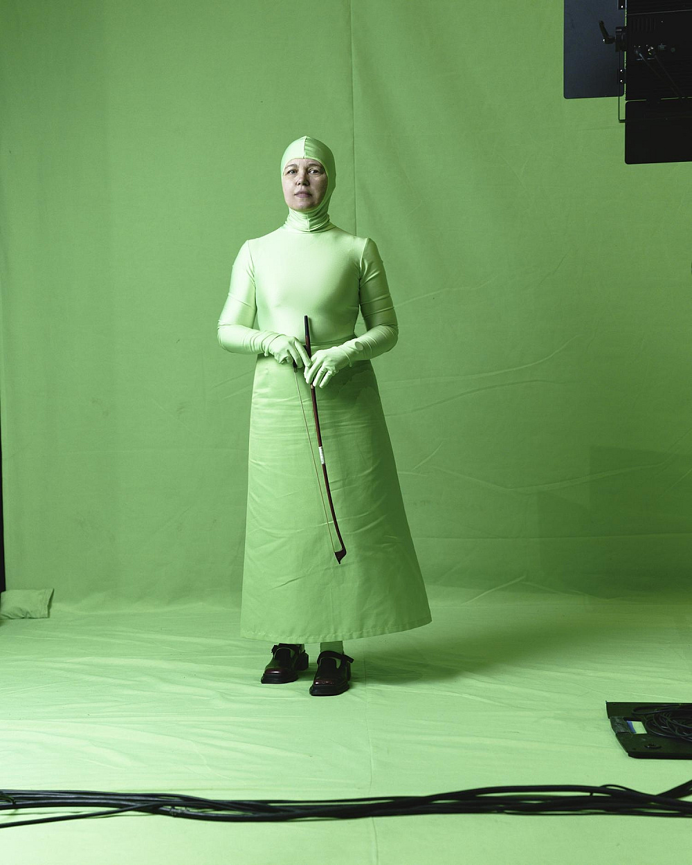 Масштабуючи зелений знімальний фон до абсолюту, заповнюючи ним сцену від стелі до оркестрової ями, змушуючи будь-якого героя виходити в це поле, я створюю тотальний маніпулятивний простір і ставлю німе запитання про те, хто має агентність в цьому полі для виголошення наративу та як він цю агентність здобув.