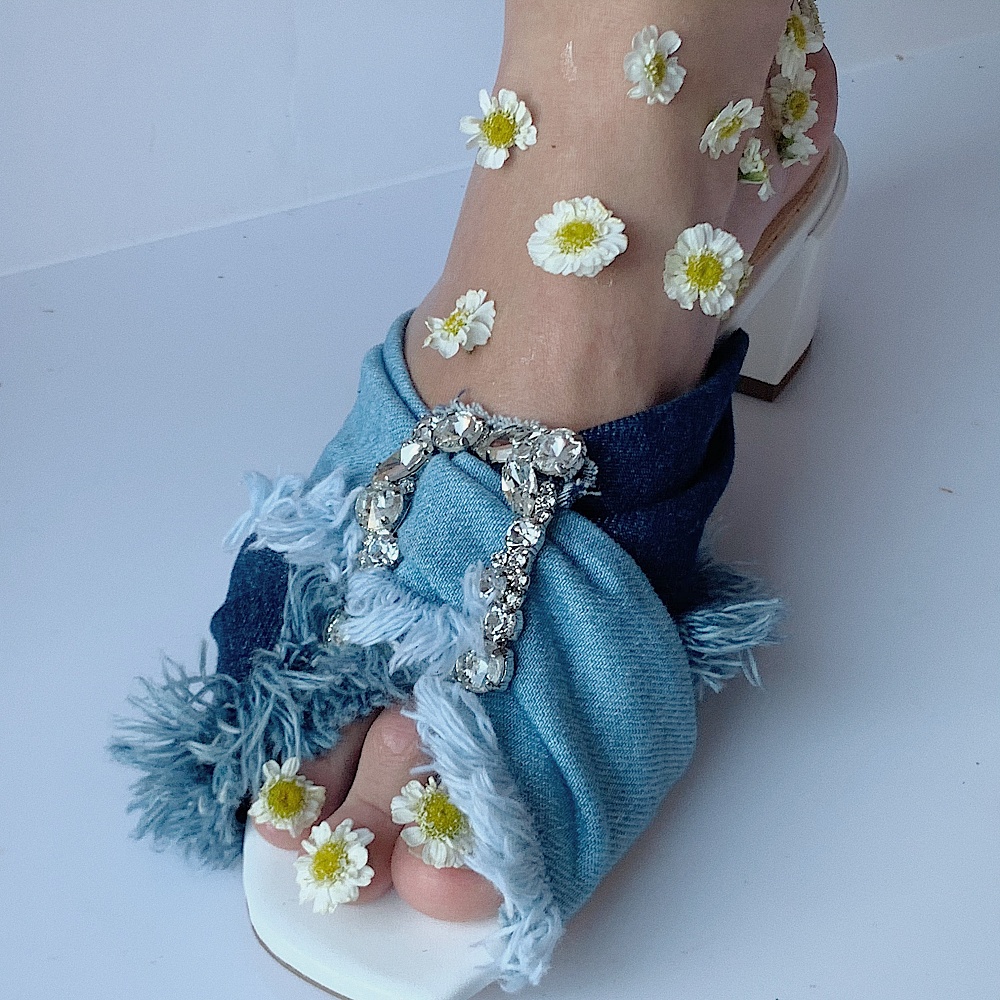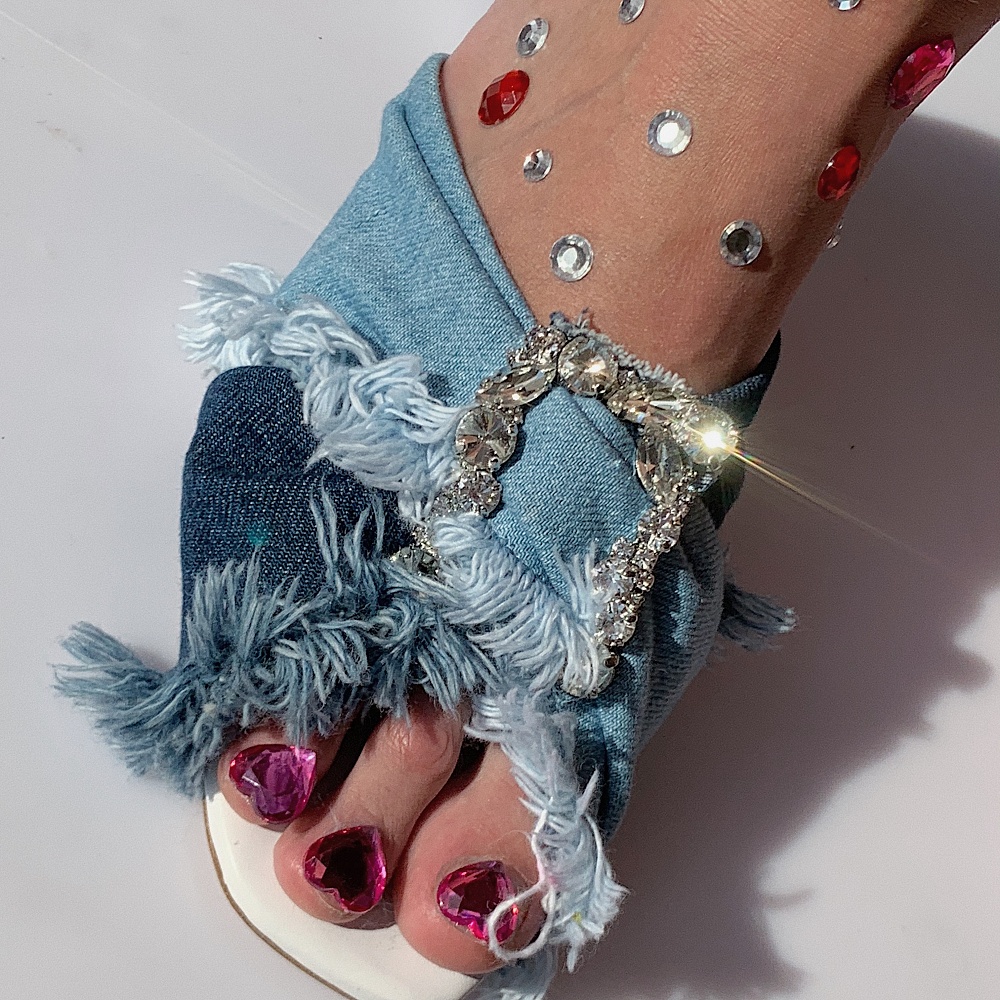 Ксения Шнайдер Эта модель универсальна: мюли выглядят довольно нарядно из-за камней и белой кожи, но сочетание с рваным денимом делает ее более универсальной. В них можно и в пир, и в мир. Каждая пара уникальна, ведь на каждой неповторимые кусочки денима. Апсайклинг, ограниченный тираж производства, ручная работа и семейный бизнес — то, что делает эту пару уникальной и по-настоящему классной.