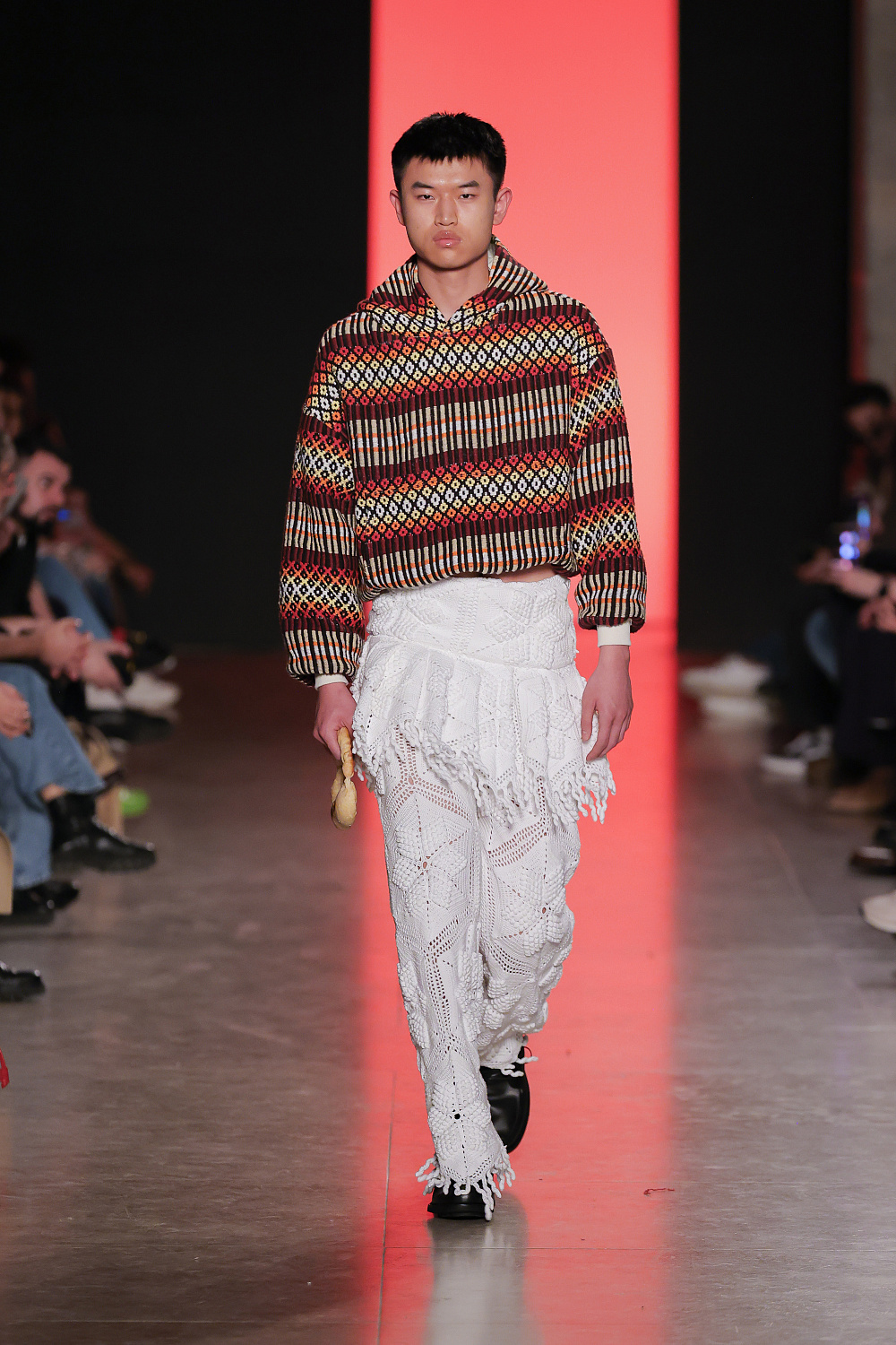 Ж. Д: Цей образ був натхнений класичними покривалами, які є майже в кожному португальському домі — чи то в їхньому власному домі, чи то в будинку бабусі, або десь у родині. Люди можуть навіть не звертати на них увагу, бо вони завжди були там. Але саме в цьому й полягає суть. Ми намагаємося взяти ці звичайні, знайомі елементи і поставити їх у абсолютно новий контекст — дати їм нове життя. Ми співпрацювали з виробником, який використовує напівпромислову техніку — більш сучасний підхід до ремесла. Він все ще має традиційний вигляд, але виготовляється за оновленими методами, які забезпечують більшу довговічність і гнучкість.