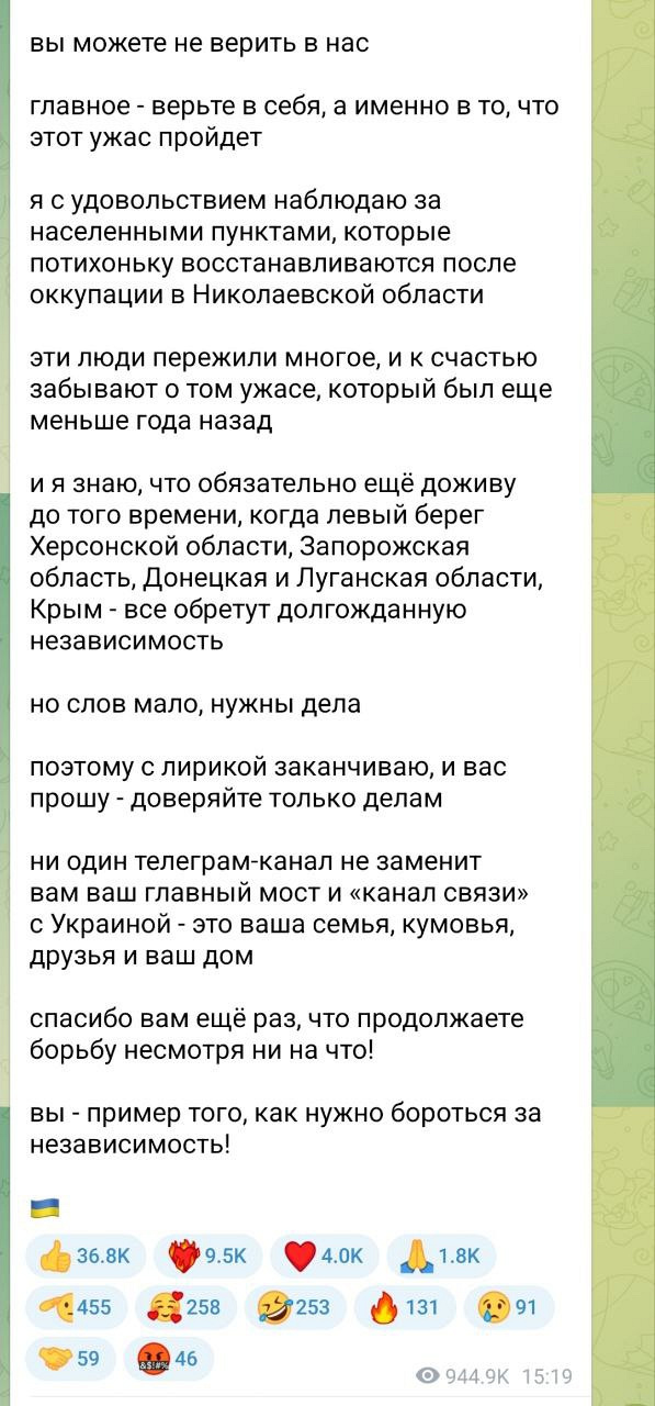 Это у людей нужно спрашивать. Я думаю, возможно, из-за того, что канал разноплановый и контент на нем меняется со временем, все зависит от кучи факторов, связанных с «основной работой». Что-то хочется подсветить, что-то нельзя подсвечивать, что-то нужно подсветить. Люди доверяют, потому что, наверное, понимают, что подводить их никто не собирается. Здесь я имею в виду как информацию об обстрелах, так и любую другую разведывательную информацию, которая может проходить через канал. С некоторыми источниками с временно оккупированных территорий сотрудничаем уже почти 2 года, и сотрудничаем весьма успешно.