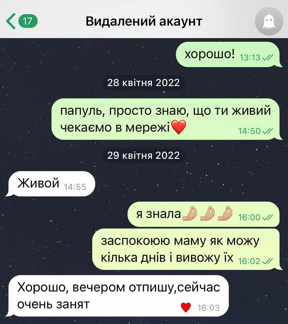 Тато писав мені раз у два-три дні. З мамою вони частіше спілкувалися, звичайно, не 24 на 7, але раз на день він міг виходити на зв’язок.