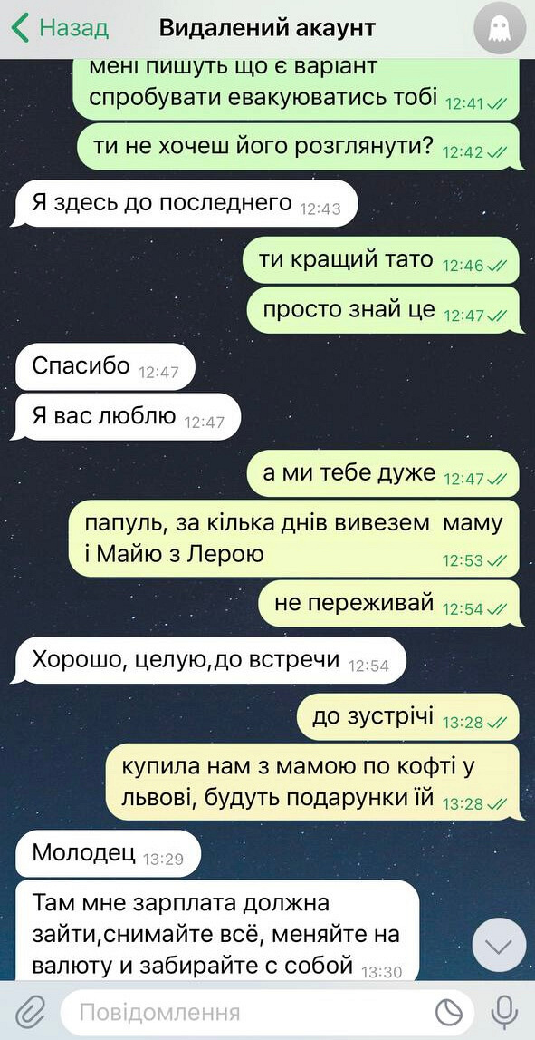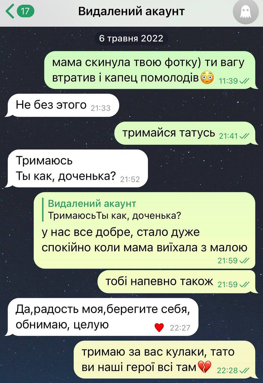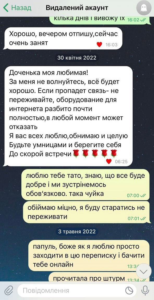 Тато не розповідав ніяких подробиць, лише один раз він написав на піку емоцій після того, як в медпункт прилетіла російська бомба й загинуло декілька близьких йому людей. Він не писав про втрати, про те, що «я здаюсь, я не можу». Він написав мамі про те, що вижив тільки через те, що готував евакуацію поранених, і попросив, щоб ми виїхали.