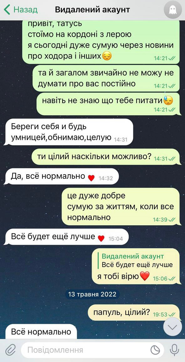 Через декілька годин після новини, що росіяни прорвалися на «Азовсталь», тато вийшов на зв’язок, і я у відчаї написала йому про те, що не знаю, що мені робити, що я готова їхати до Зеленського, до кого завгодно, тільки щоб його врятувати.