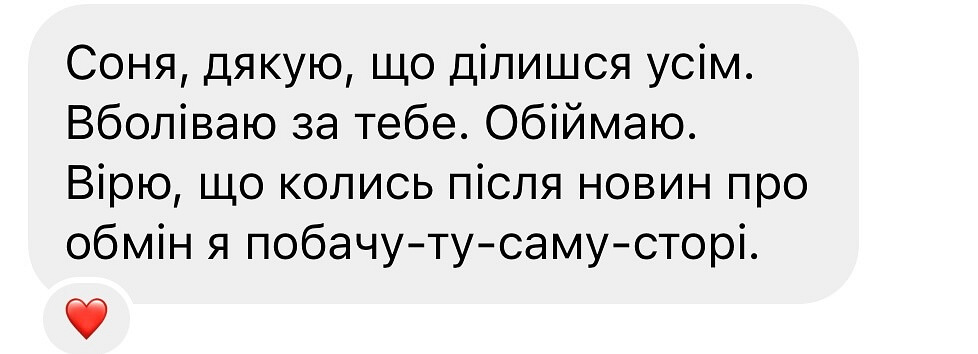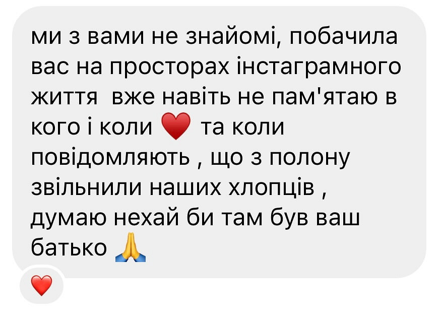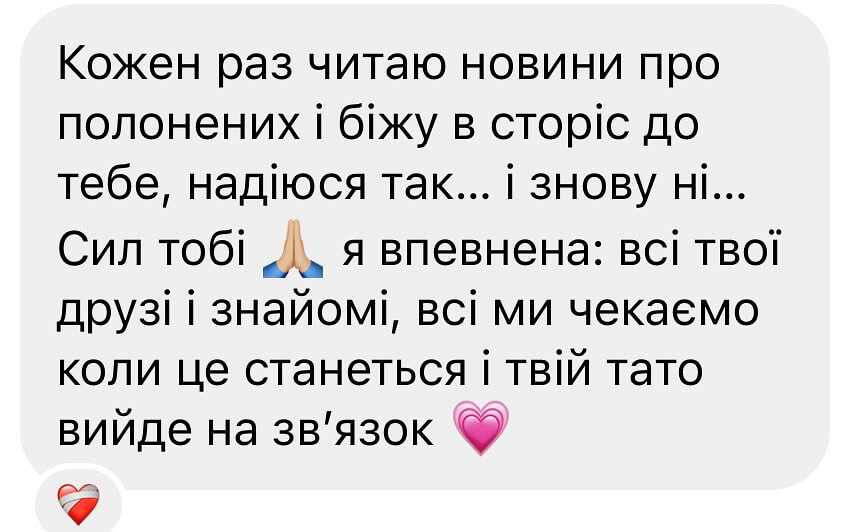 Не можу відповісти за весь соціум, але от, наприклад, зі своєї Instagram-сторінки я знаю про те, що є величезна кількість людей, із якими я особисто незнайома, які просто колись стежили за моїм життям або приєдналися під час війни, щоб слідкувати за моєю діяльністю, — вони після кожного обміну пишуть мені. Часто ці повідомлення починаються тим, що «кожен раз, коли я читаю про обмін, я заходжу на вашу сторінку, сподіваючись прочитати, що вашого тата звільнили». Це дає велику енергію для руху та підтримку.