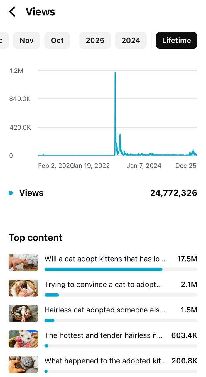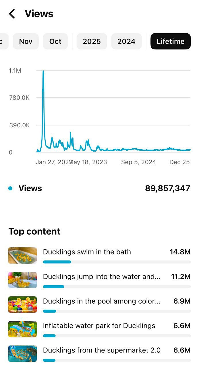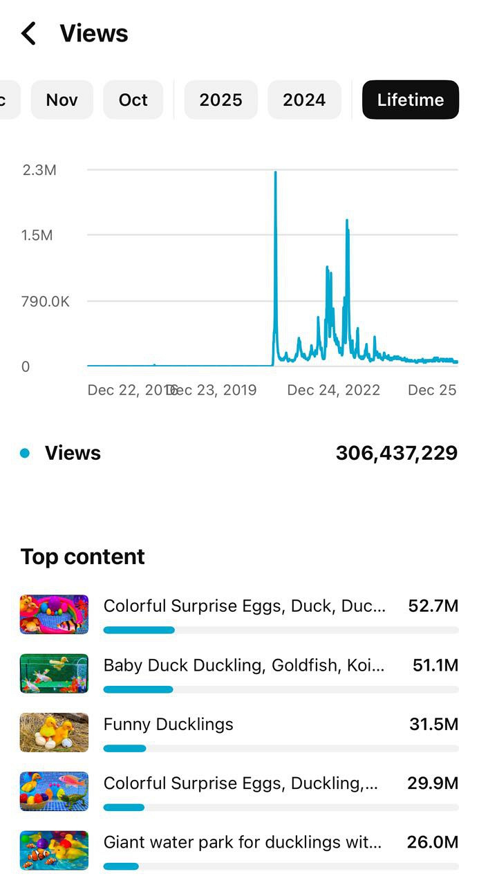 На одному з моїх активних каналів під назвою «Fish Surprise» на цей час більше ніж 306 мільйонів переглядів. На іншому каналі «Funny Ducklings» більше 89 мільйонів переглядів. На третьому каналі «Plush Kittens» більше 24 мільйонів переглядів.