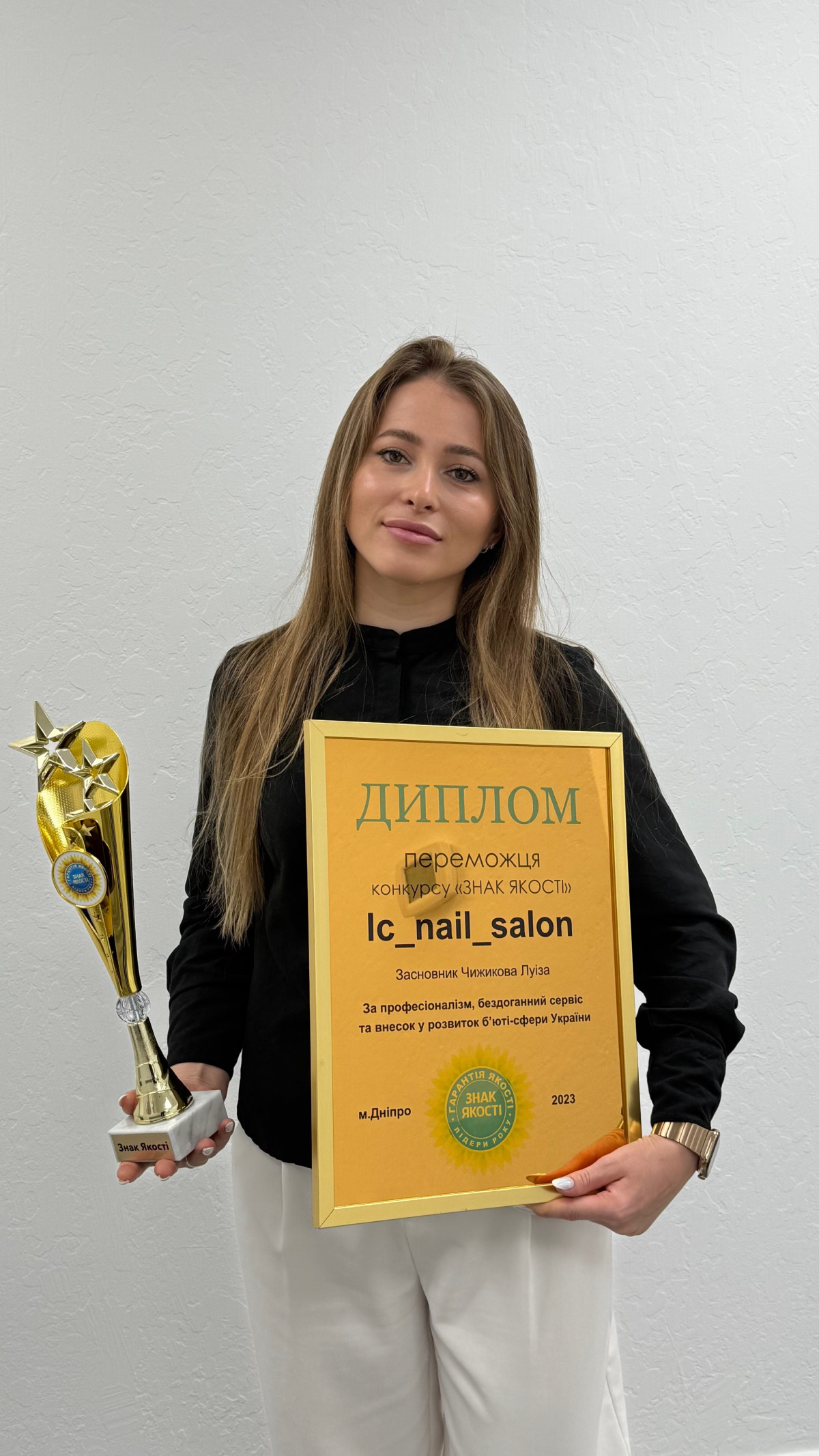 Це завжди приємно — коли професійна спільнота відзначає твою роботу. Протягом останніх років я отримала нагороди, серед яких: Rising Star in Nail Industry (2021) — відзнака у рамках галузевого конкурсу, яка підкреслила перспективність мого підходу; Top The Best Beauty Studio (2022) — результат відбору серед салонів із високими стандартами сервісу; Top Nails Trainer (2023) — оцінка моєї діяльності як викладачки та наставниці; а також «Знак Якості» (2023) — національна премія за стабільно високий рівень обслуговування та внесок у розвиток бʼюті-сфери в Україні.