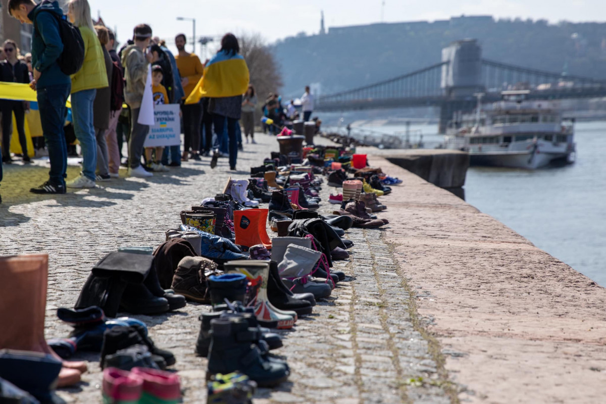 У Будапешті на березі Дунаю організатори Маршу виклали 300 пар ношеного взуття в пам’ять про щонайменше 300 загиблих від авіаудару РФ по Драматичному театру в Маріуполі.