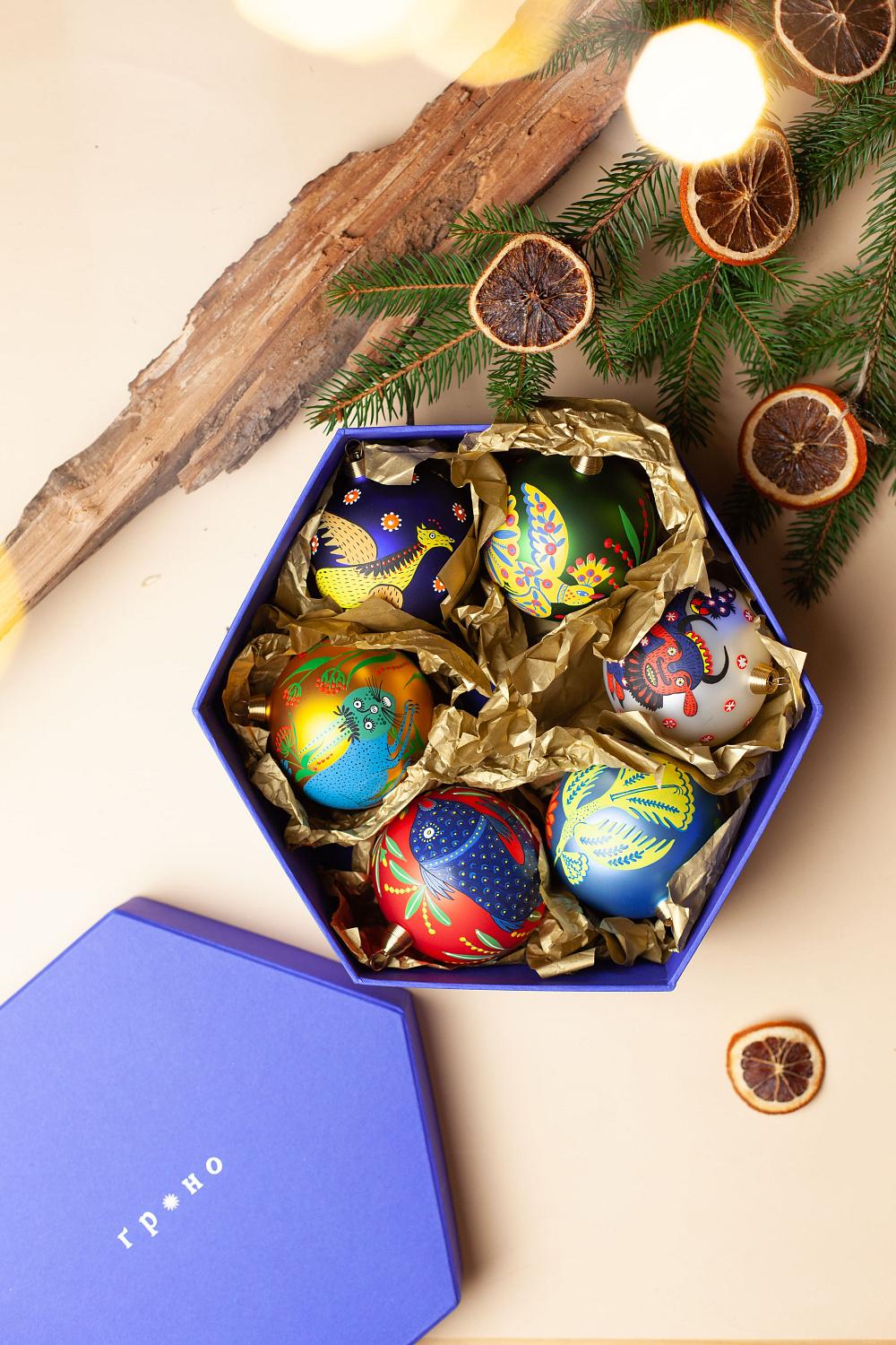 Нестандартний подарунок, який має особливе значення. Набір із шести скляних новорічних куль, розписаних вручну за мотивами легендарних картин української художниці Марії Примаченко, був створений львівським брендом «Ґроно» з метою збереження та популяризації культурної спадщини художниці. До дебютної колекції новорічних прикрас від бренду «Ґроно» разом з набором куль увійшла верхівка на ялинку «Тризуб» як символ волі та єдності народу України. Ялинкові прикраси народилися у співпраці з Фондом родини Примаченко та стануть яскравим доповненням до вашої колекції ялинкових іграшок.