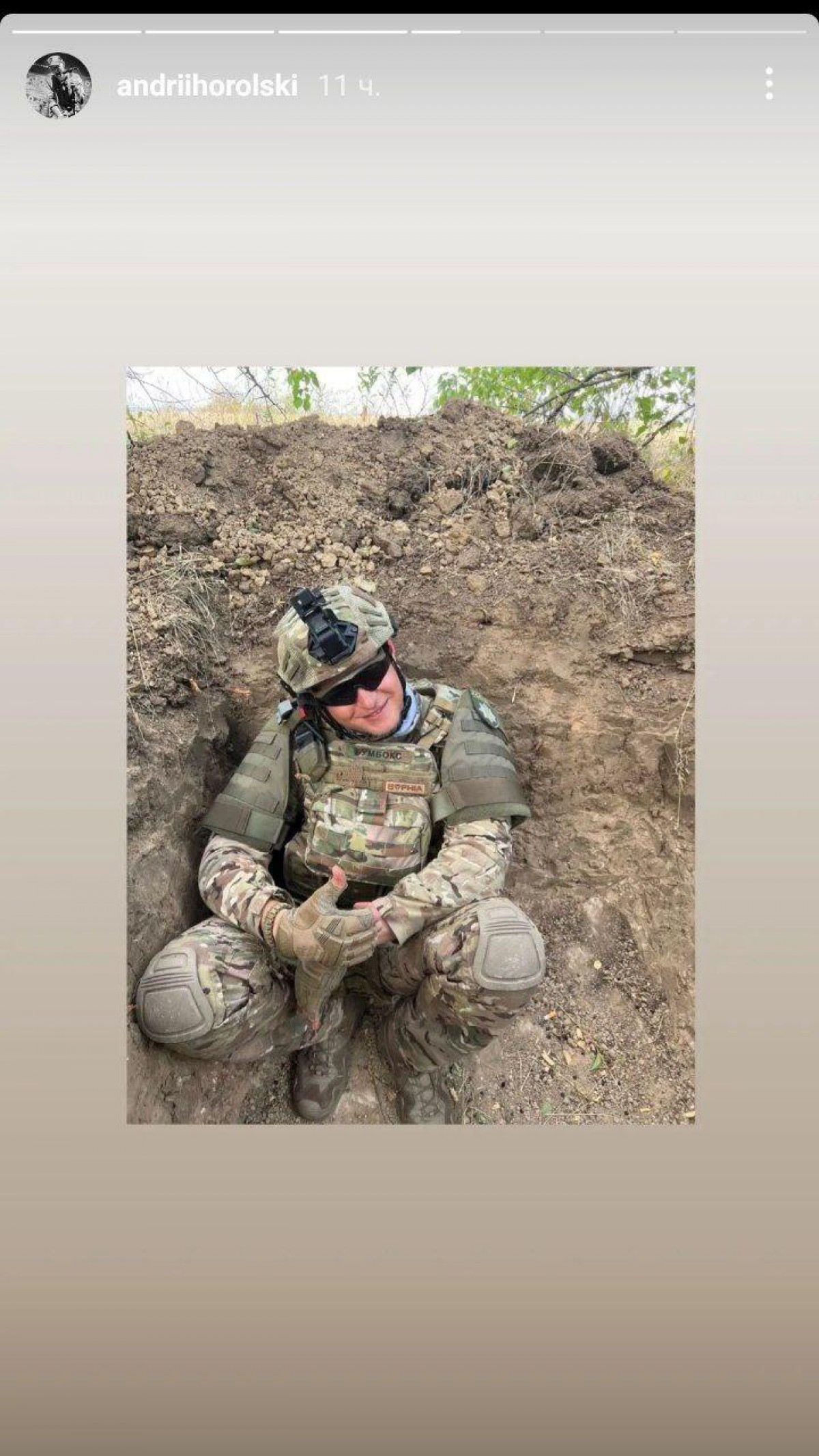 Так, днями співак показав опублікований у Stories знімок з окопу. На фото Андрій з усмішкою на обличчі позує в повній амуніції.