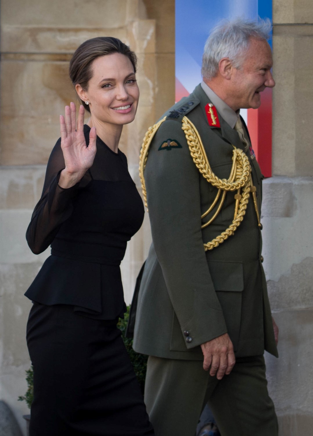 .jpg) Голливудская звезда прибыла с официальным визитом на миротворческий саммит ООН в Лондон, где приняла участие в саммите Организации Объединенных Наций. Актриса встретилась с заместителем начальника штаба обороны – генералом сэром Гордоном Мессенджером и выступила с речью перед участниками саммита. Джоли появилась на мероприятии в черным платьем, которое в очередной раз подчеркнуло ее худобу. Образ она дополнила бежевыми лодочками и парой сережек.