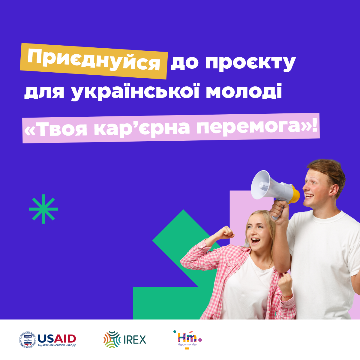 Кар’єрний портал Happy Monday (ГО «Професіонали майбутнього») в межах програми «Мріємо та діємо» запускає проєкт для української молоді (включаючи ВПО) «Твоя кар’єрна перемога». Його мета — надати допомогу молодим чоловікам та жінкам, дівчатам та хлопцям з професійним розвитком та пошуком роботи.
