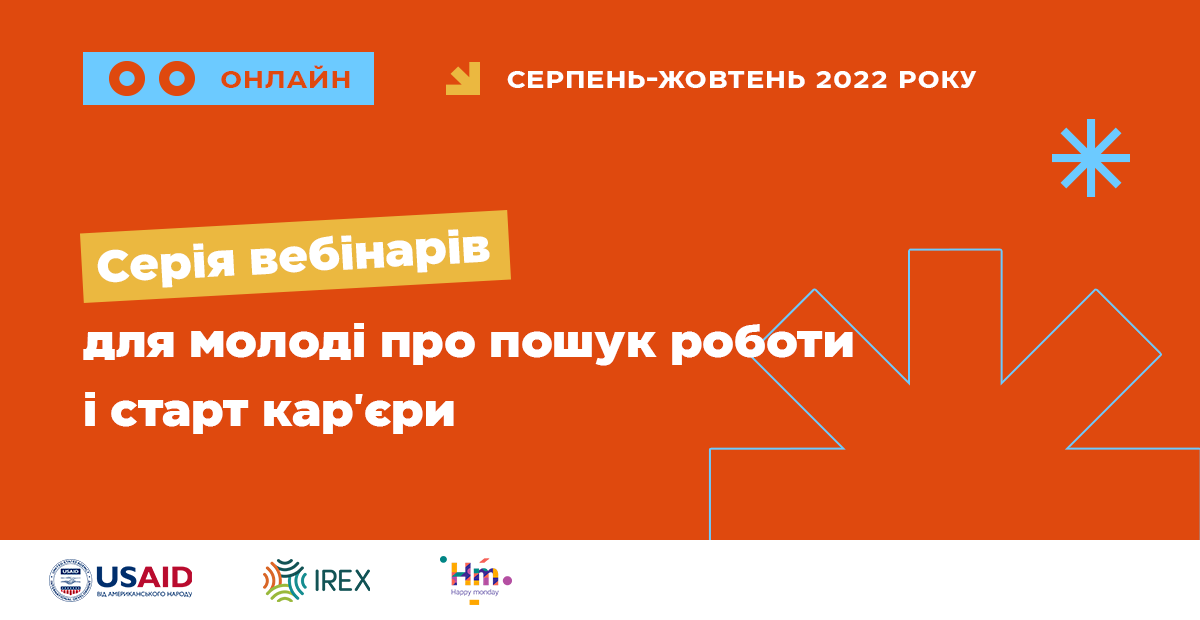 Безкоштовна серія вебінарів про підготовку до пошуку роботи, особливості працевлаштування та старт кар’єри для української молоді. В межах проєкту для української молоді (з-поміж ВПО) «Твоя кар’єрна перемога». Проєкт підготований для українців та українок віком від 18 до 35 років (включаючи ВПО), які внаслідок війни втратили роботу та/або джерела доходу й наразі шукають нові можливості для працевлаштування та професійного розвитку.