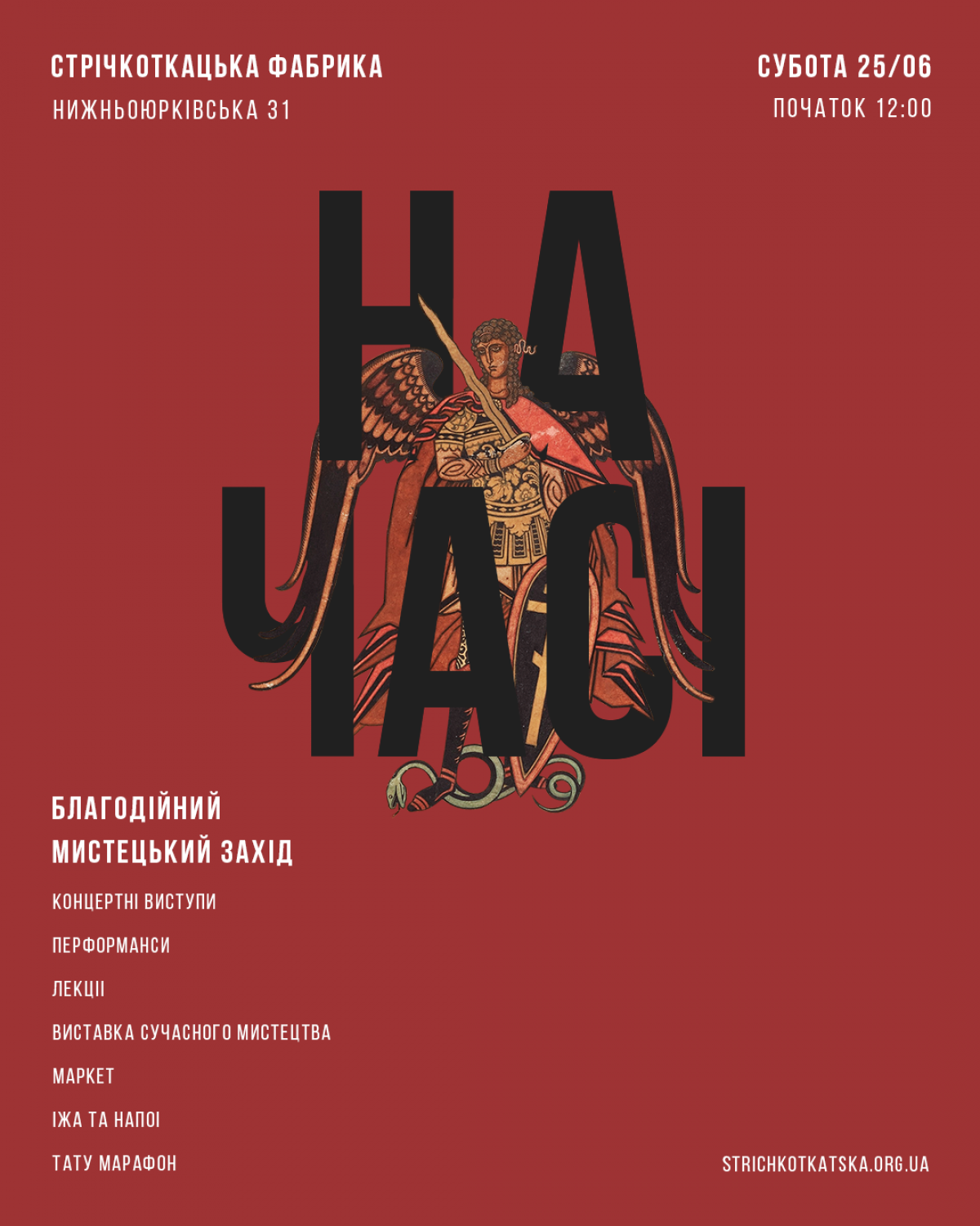 25 червня в Києві відбувся благодійний мистецький захід «На часі», що мав на меті зібрати кошти на підтримку творчих об`єднань Стрічкоткацької фабрики на Подолі. Також організатори підтримали українських митців та культурні простори, які зараз знаходяться у скрутному становищі.