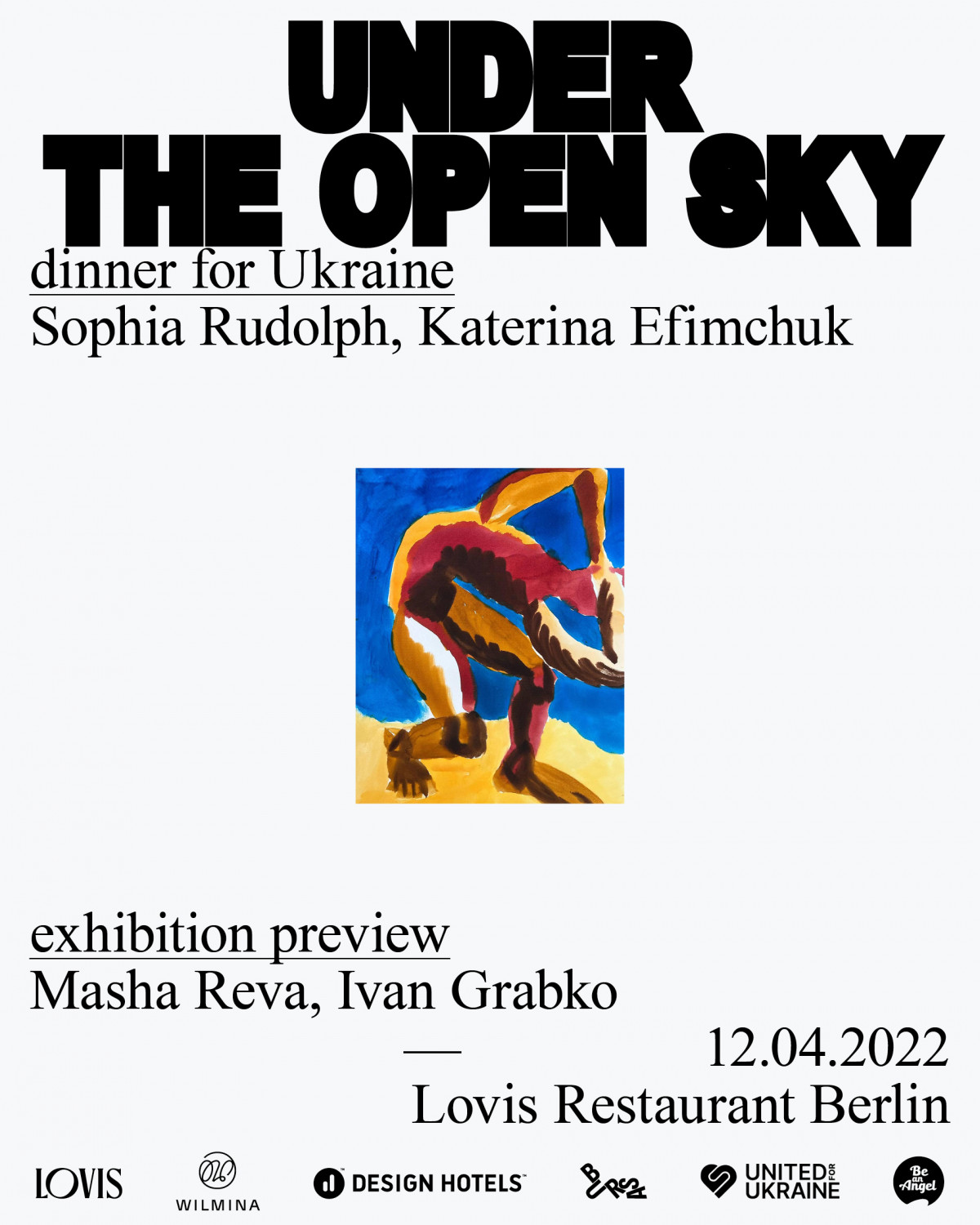 Першим заходом у рамках UNDER THE OPEN SKY стане вечеря в чотири руки у берлінському ресторані Lovis Restaurant від шефині ресторану Софії Рудольф і шефині київського ресторану Wine Love Катерини Єфімчук. 100% зібраних пожертв будуть передані на підтримку Kyiv Volunteer — об’єднанню з 23 ресторанів і кафе Києва, які щодня надають понад 15 000 порцій для українських бійців, лікарень, дитячих садків та будинків для літніх людей.