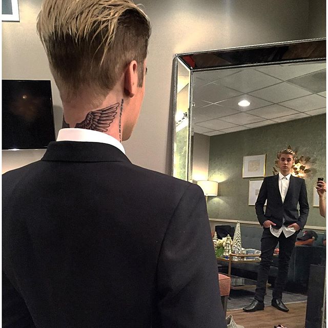 В 21 год Джастин Бибер уже может похвастаться довольно внушительной галереей татуировок на теле. И вчера певец опубликовал снимок очередного шедевра: звездный исполнитель вытатуировал на шее пару крыльев. На фотографии в своем Instagram Бибер позирует в белой рубашке и смокинге, а под снимком красуется надпись «Новое тату». Данный рисунок очень напоминает татуировку футболиста Дэвида Бекхэма, правда, у спортсмена между крыльев расположен еще и крест. Сложно сказать, вдохновлял ли Джастина пример старшего товарища, но не заметить определенного сходства между двумя этими изображениями сложно. В настоящее время на теле исполнителя красуется 52 татуировки.