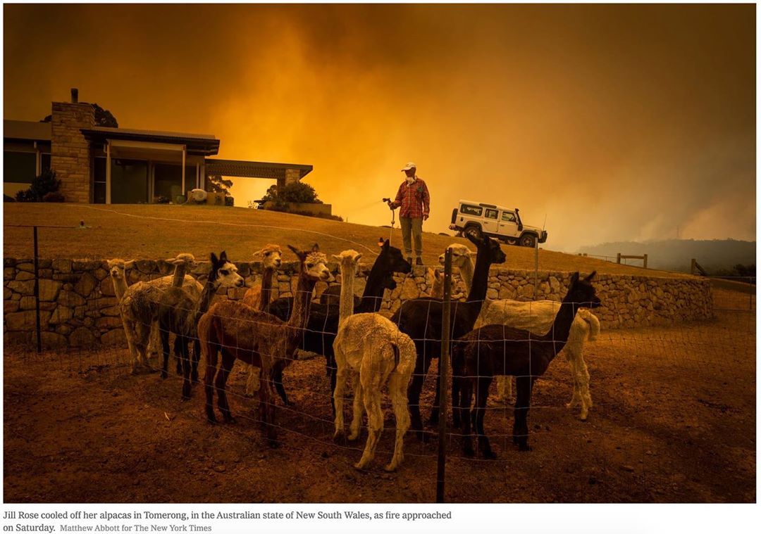 В Австралії продовжує бушувати масштабна пожежа, яка вже забрала життя щонайменше 24 людей. У результаті стихійного лиха зруйновано близько 1500 будинків та вигоріло 5,2 мільйонів гектарів землі. Непоправної шкоди вогонь завдає флорі та фауні. За оцінками фахівців Сіднейського університету, в пожежах загинуло близько мільярда тварин, деяким видам загрожує вимирання. Тваринам, яким вдалося вижити, їжу доставляють повітрям. Переважно це солодка картопля та морква. Зоозахисники та волонтери скидають їжу туди, де вогонь випалив майже все. Найбільш потерпілими видами вважають коал та опосумів. Крім того, австралійський уряд прийняв рішення про відстріл верблюдів, які через сильну засуху шукають поживи в поселеннях аборигенів, забруднюючи водойми та знищуючи запаси їжі.