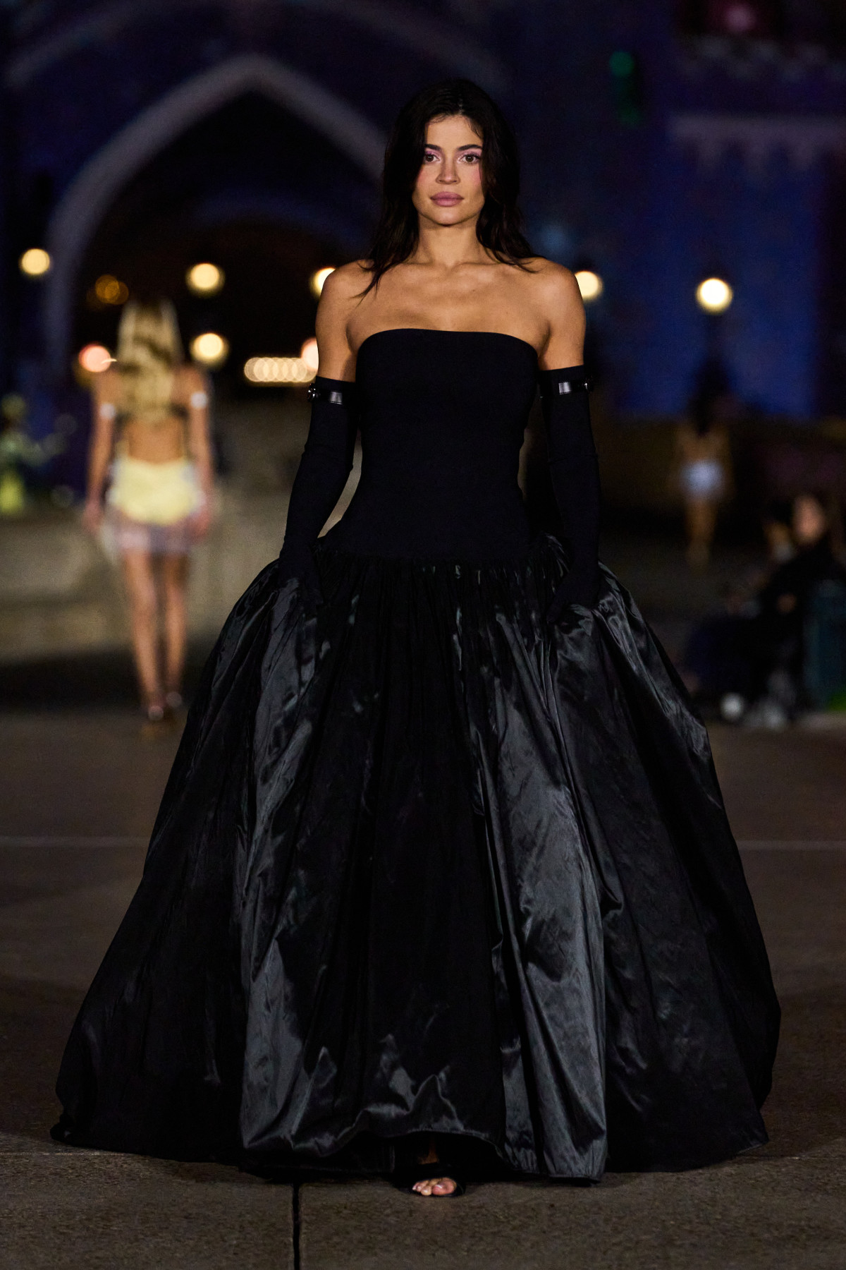Зірка пройшла подіумом, на фоні якого виднівся Замок сплячої красуні в Діснейленді. Вона вдягнула бальну сукню з тафти чорного кольору, яка вирізнялася пишною спідницею і верхом без бретелей. Її довершили високі рукавички та відкриті босоніжки. Гості шоу одразу ж відзначили впевненість, яку випромінювала Кайлі під час свого виходу.