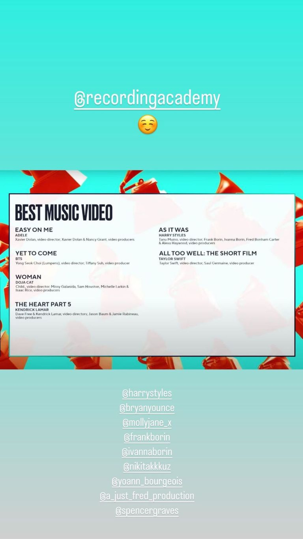 Про номінацію українки стало відомо під час онлайн-трансляції, в якій оголошували номінантів. За перемогу в категорії «Найкраще музичне відео» зірка побореться з такими конкурентами: Easy On Me — Адель, Yet To Come — BTS, The Heart Part 5 — Кендрік Ламар, All To Well: Short Film — Тейлор Свіфт.