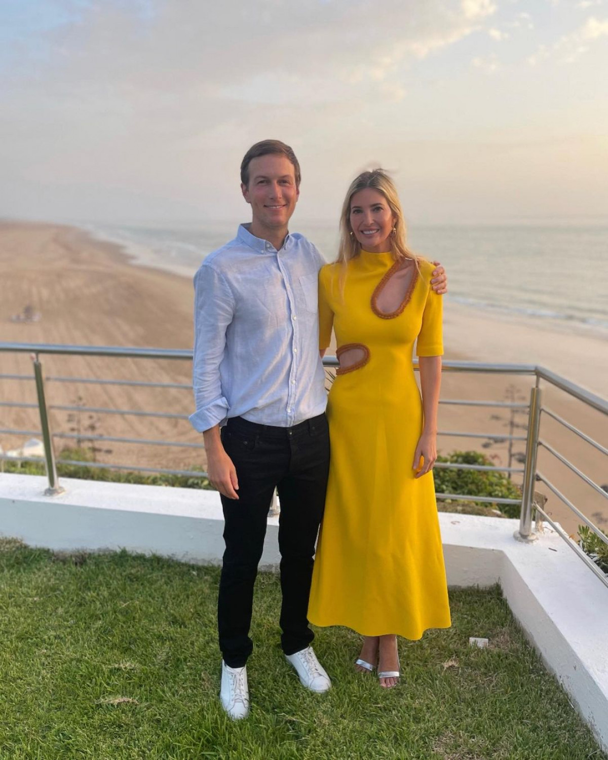 На відпочинок донька Дональда Трампа спакувала простий і разом з тим стильний гардероб. Так, на вечерю з коханим Іванка одягла яскраву мідісукню кольору сонця з вирізами в ділянці декольте та талії. Образ Трамп доповнила сережками та сріблястими босоніжками.