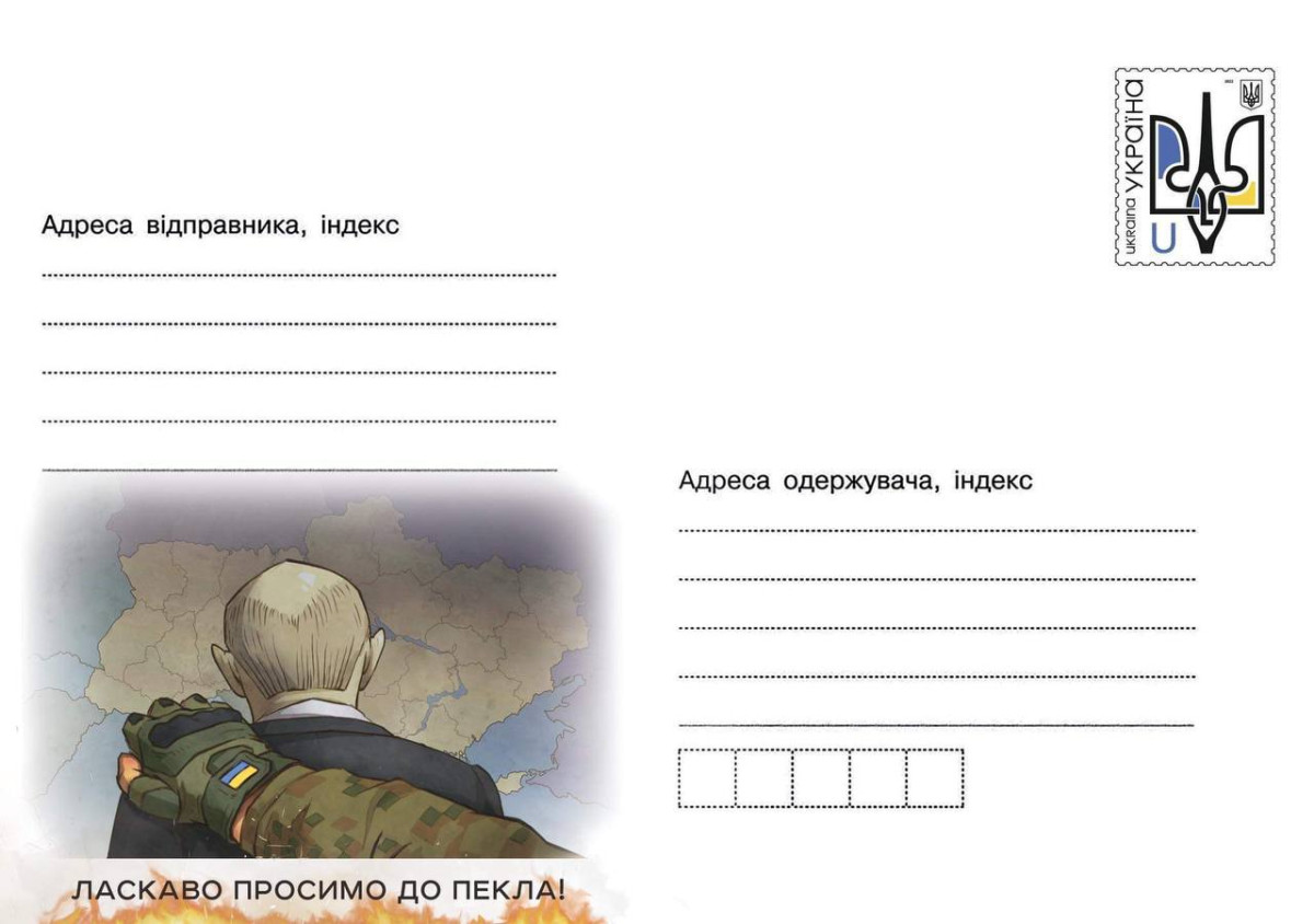 На конверті зображено, як українські військові «відправляють» до пекла президента РФ Путіна, а зверху розміщено марку «Тризуб».