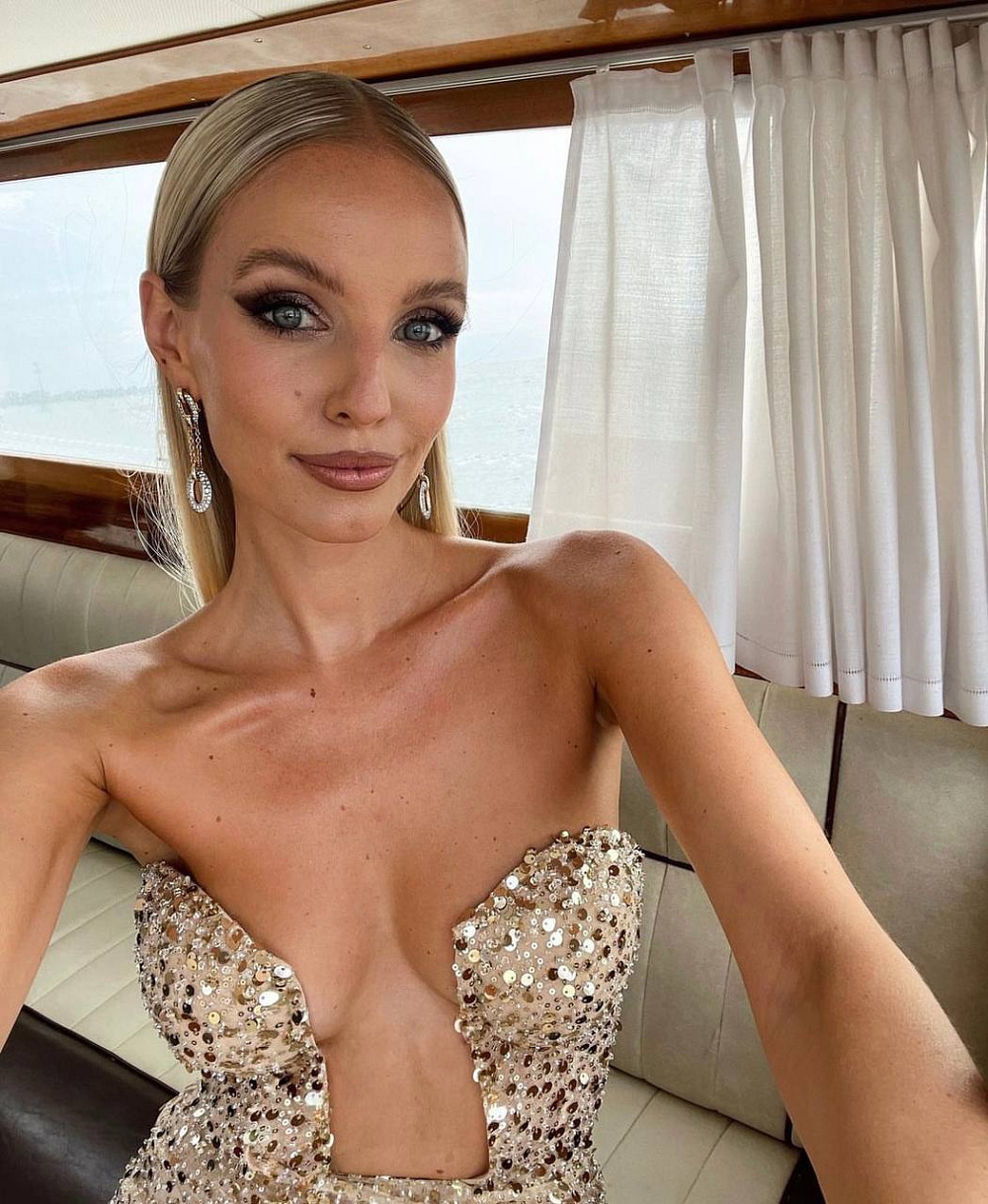Цьогоріч бренд ексклюзивно створив для Леоні сяючу вечірню сукню без рукавів у золоті. Максимальна довжина та невеликий шлейф зробили образ інфлюенсерки абсолютно приголомшливим.