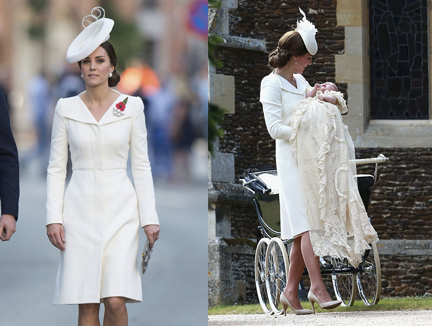 Особо приятен общественности тот факт, что зачастую герцогиню можно увидеть в одних и тех же платьях. Так, например, недавно Кэтрин вышла на публику в белом костюме Alexander McQueen, в котором впервые была замечена на крещении дочери в 2015 году.