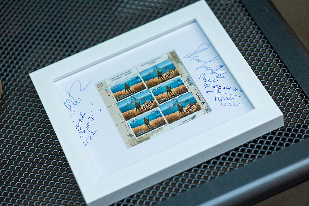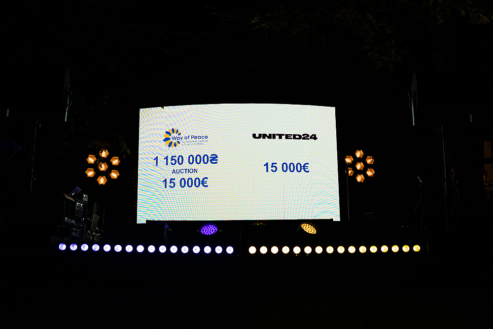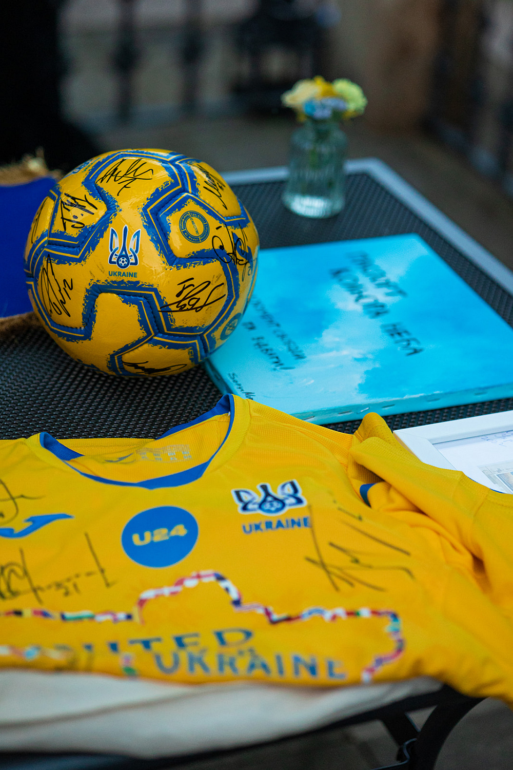 Зібрати кошти вдалося також завдяки аукціону в рамках вечері, де розіграли особливі лоти з України: лімітовану марку «Русскій воєнний корабль... ВСЬО» за 385 000 грн, яку надали засновник фонду «Дорога миру» Микола Тищенко та гендиректор Укрпошти Ігор Смілянський, картину художниці Соні Морозюк «Паспорт кольору неба», колекційне вино сапераві 2018 року від ACE & W by Stakhovsky, а також спеціальні лоти від національної збірної України з футболу, кошти від продажу яких передали у Фонд Президента України «United24», — вимпел, мʼяч та футболку з підписами гравців.