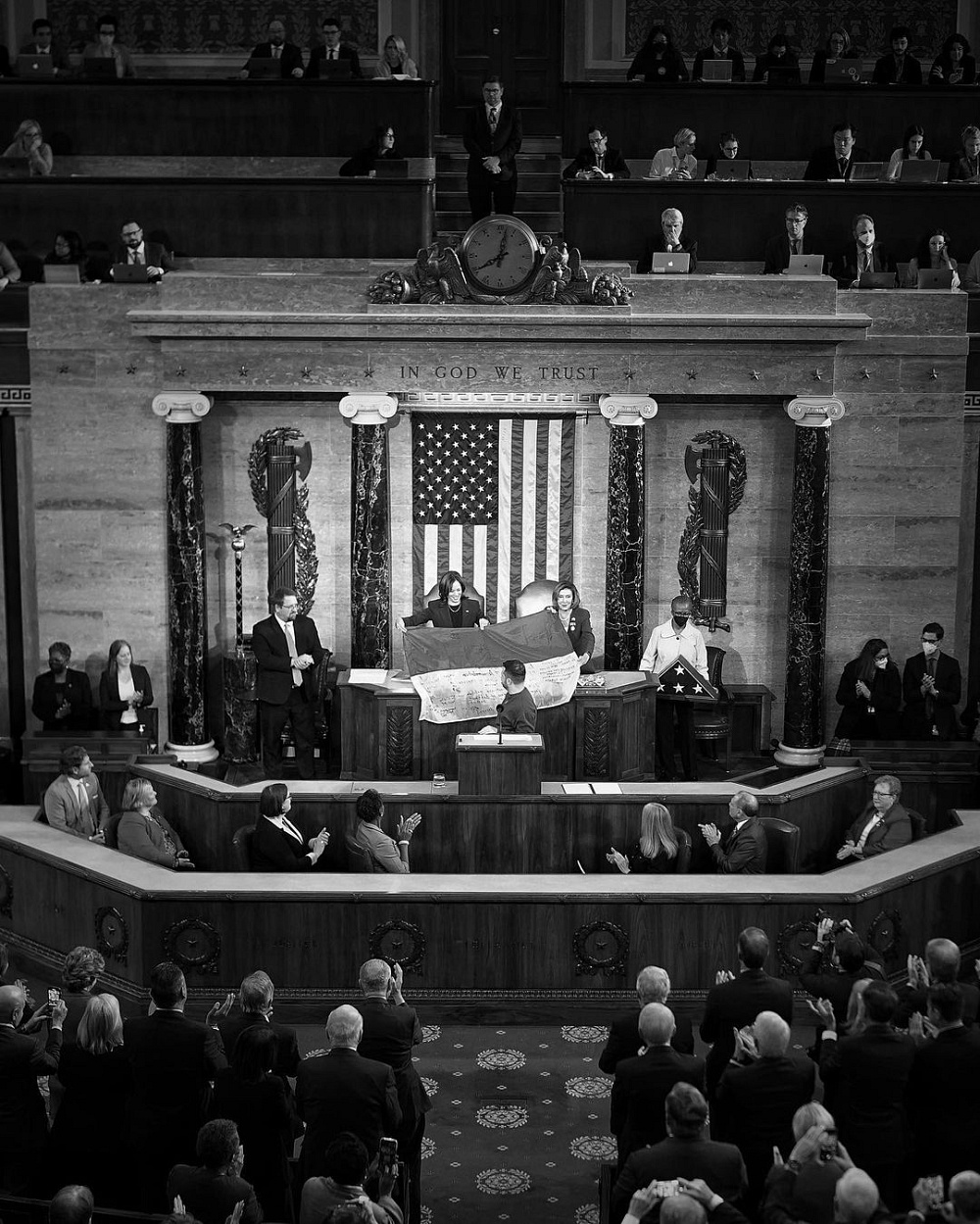 Володимир Зеленський під загальні оплески розгорнув прапор і передав його Ненсі Пелосі. Своєю чергою Конгрес подарував президенту України американський прапор як символ цього візиту.